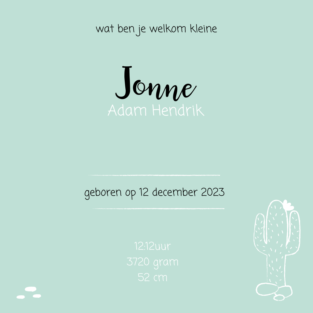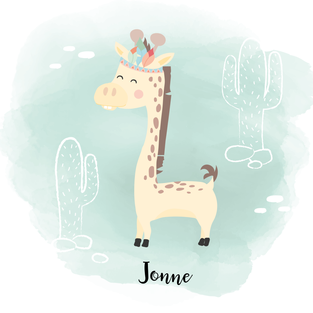 Vrolijk geboortekaartje voor een zoontje, met een giraffe met bohemian verenband, mintgroene watercolour en tekeningen van cactussen. Maak hem compleet met eigen teksten en een bijpassende envelop!