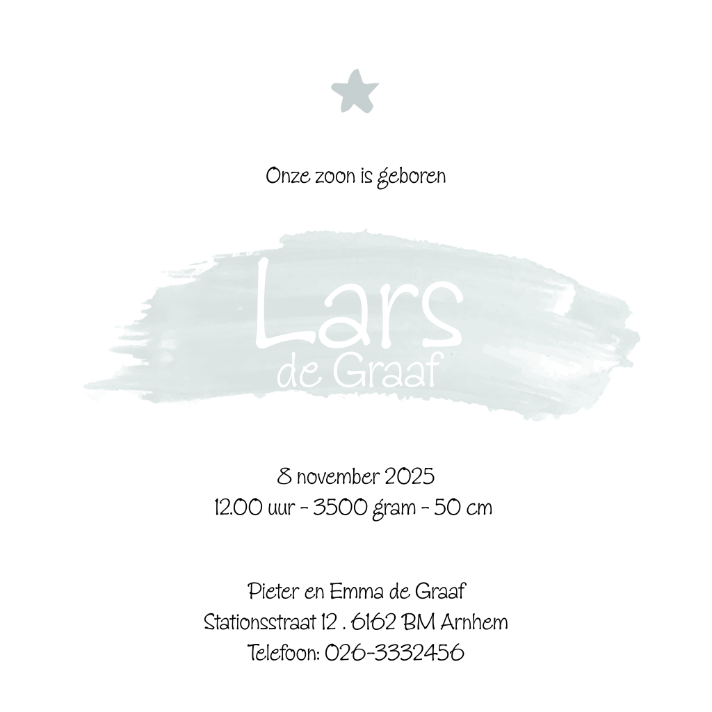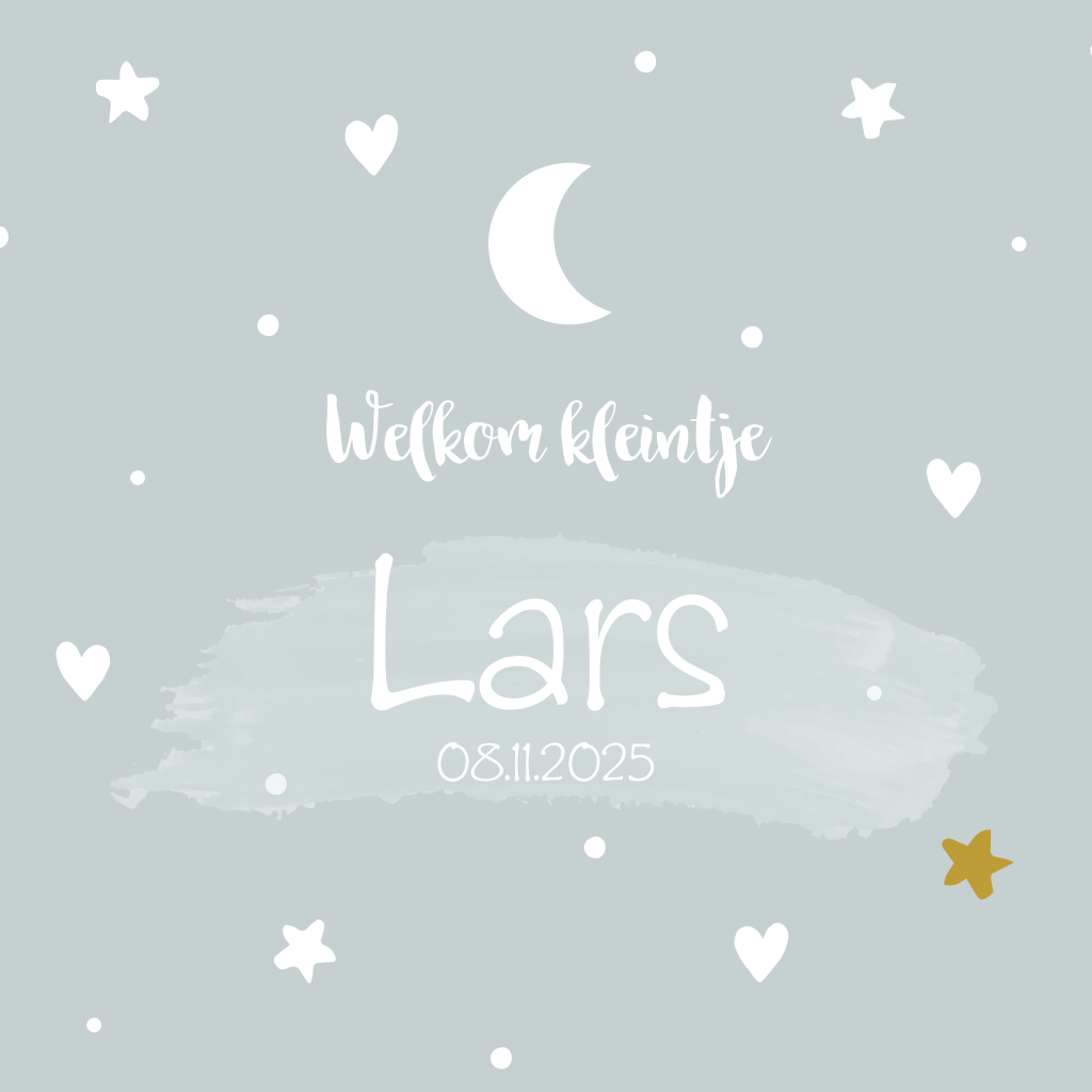 Een hip geboortekaartje voor een jongen! Deze kaart is versierd met stippen, sterren, een maan en hartjes. Eén van de sterren is in goudkleur. Origineel aan dit kaartje is de verfveeg bij de naam. Heb je liever een andere kleur dan grijs? Pas dit eenvoudig aan in de online editor.