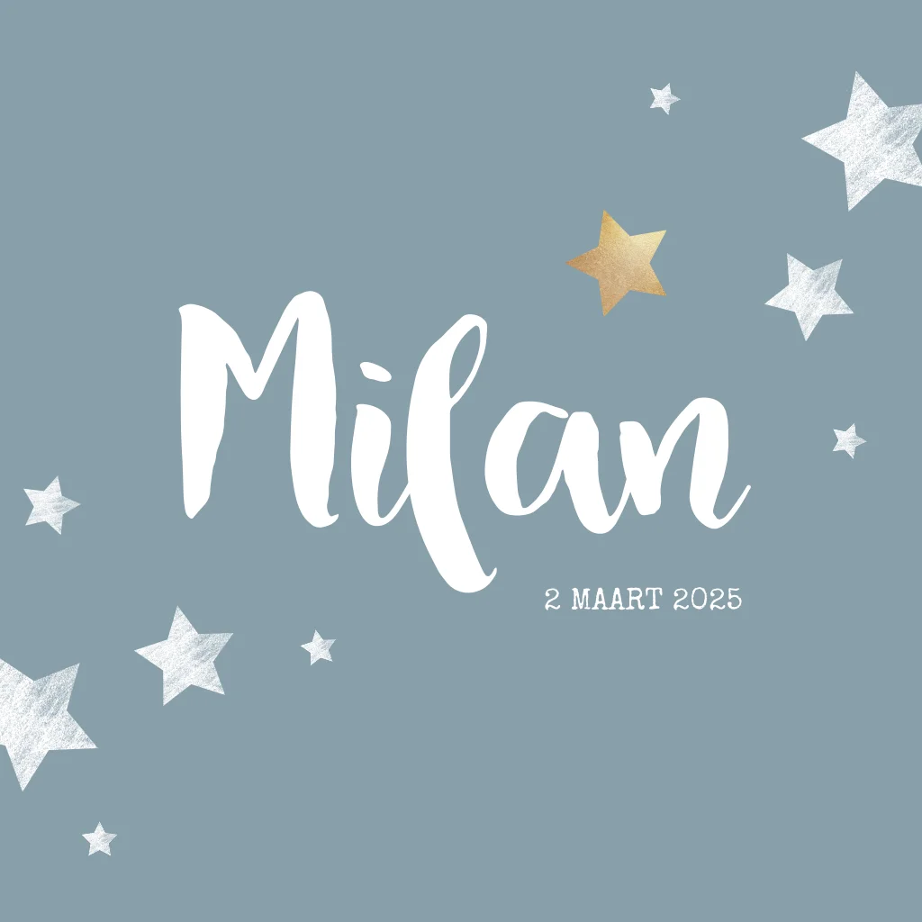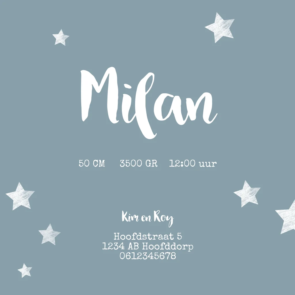 Stoer kaartje voor de geboorte van je zoontje. Blauw/grijs met sterren van witte verf. Plaats aan de binnenkant een mooie foto van de kleine man zodat iedereen hem alvast kan zien.
