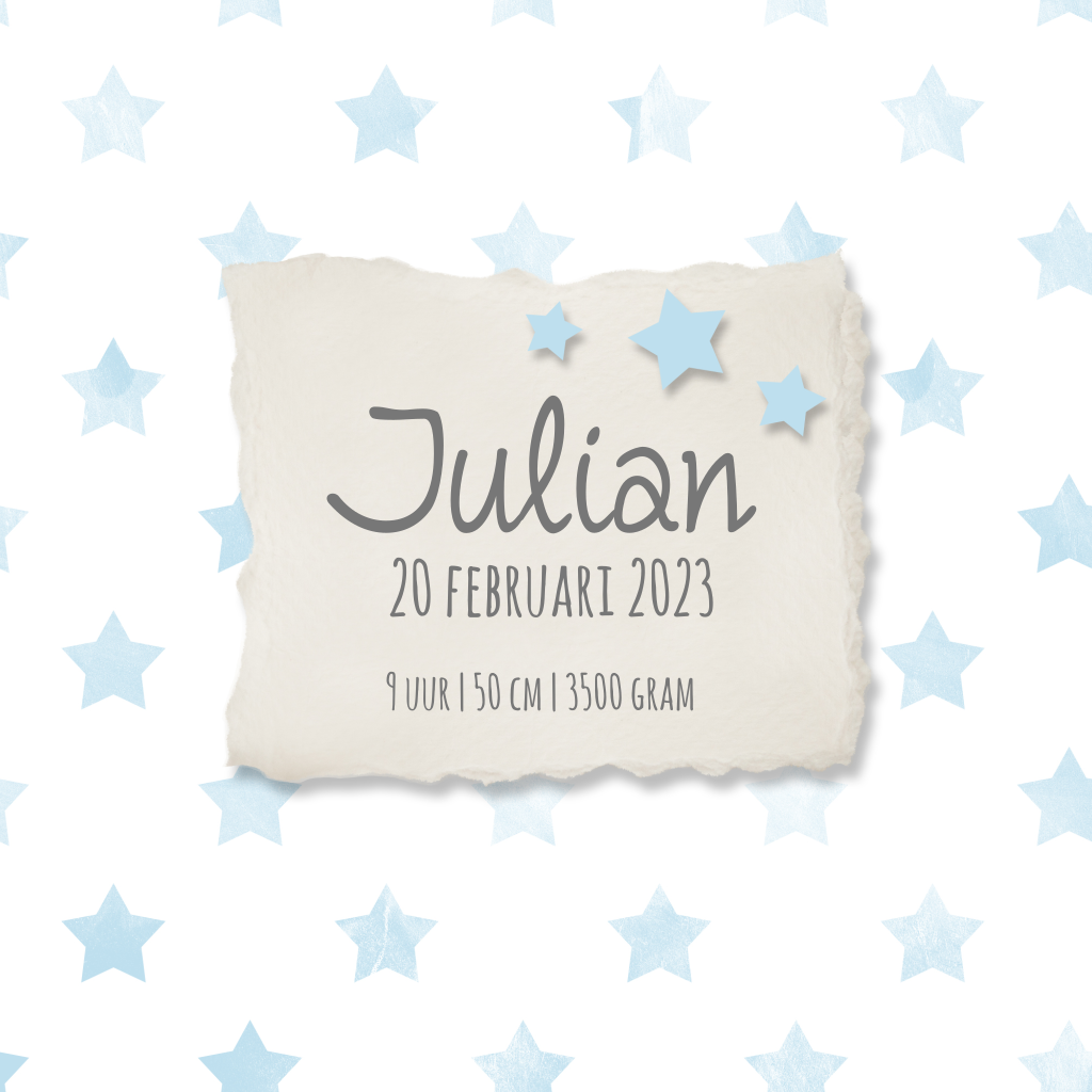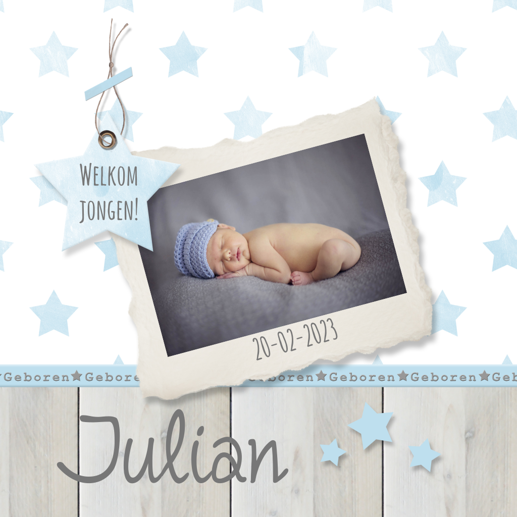 Voeg je eigen foto toe aan dit lieve geboortekaartje voor een jongen. Met een achtergrond van hout en sterren en een label in stervorm.