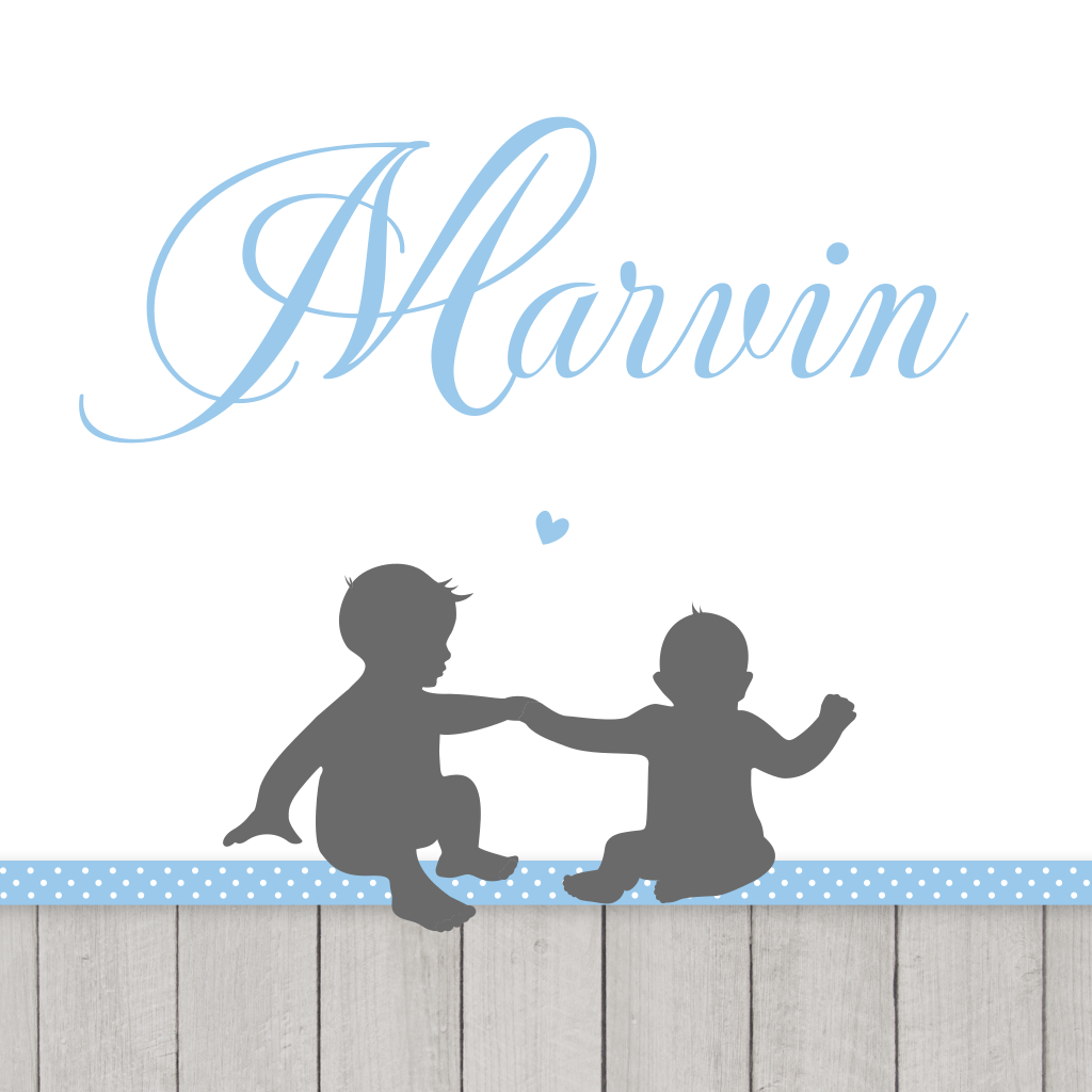 Het jongetje in silhouet hout zijn babybroertje vast. Beide jongens zitten op een ondergrond van blauw lint en hout. De letters maken het geboortekaartje sierlijk en klassiek. Wist je ook dat je de silhouetjes zelf aan kunt passen, zodat ze meer op jouw kinderen lijken? Tussen de afbeeldingen van de clipart staan silhouetjes waarmee je de kindjes op het kaartje kunt vervangen.