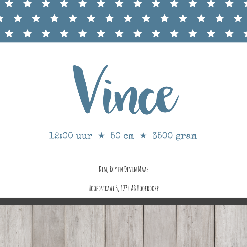 Een stoer babykaartje voor de geboorte van je zoon met steigerhout, een labeltje en sterretjes. Neem ook een kijkje naar onze sluitzegels!