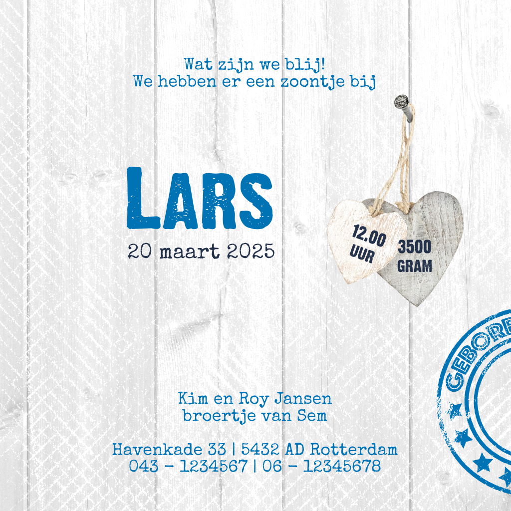 Een cool geboortekaartje met hout, een jeans ster, houten harten een stempel en leuke teksten, zoals 'welcome to the world'. Heb jij al een ouder kindje? Dan wil je vast het gedichtje op de binnenkant niet vervangen.