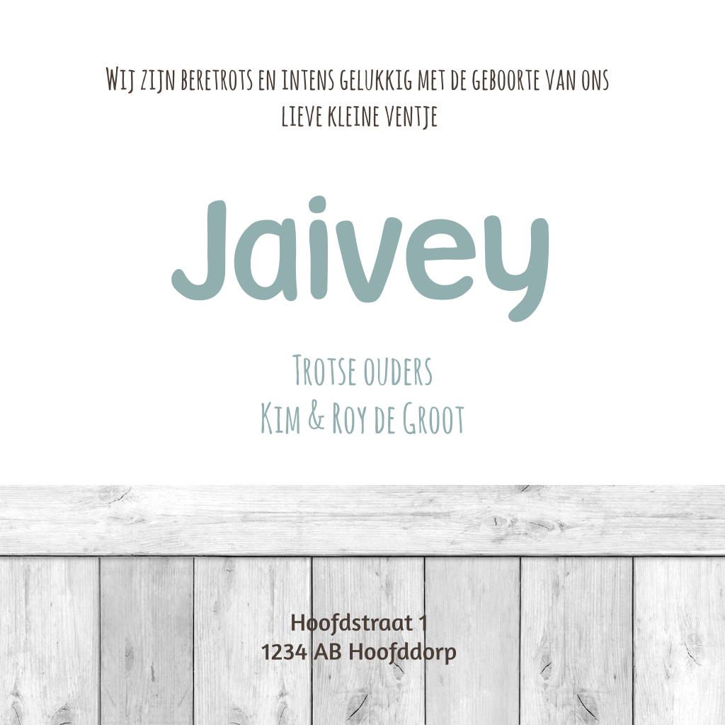 Stoer geboortekaartje met een lief uiltje, witte wolkjes en vergrijsd hout.