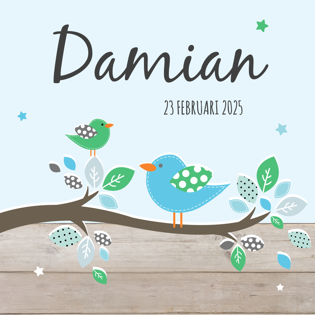 Stoer geboortekaartje voor een lief zoontje en broertje. De sterren, het hout en vogel maken dit kaartje helemaal af.
