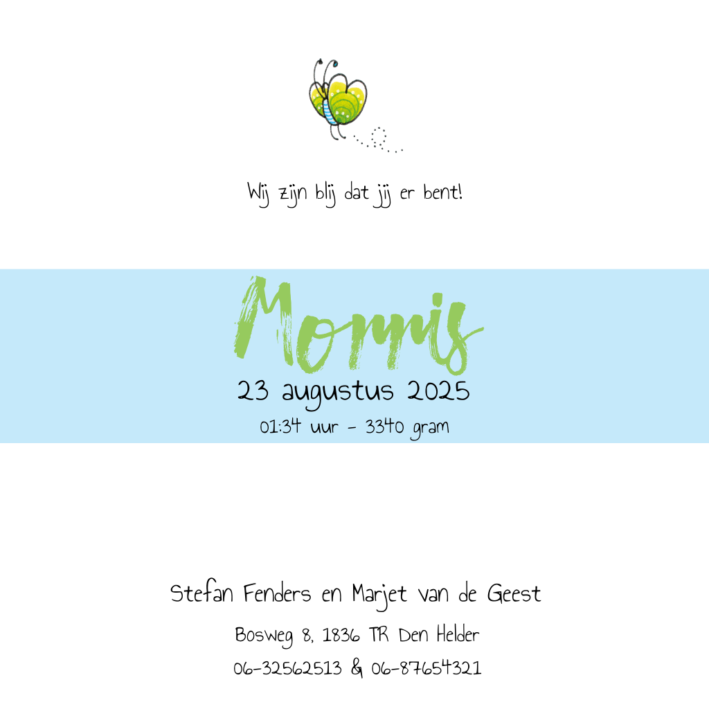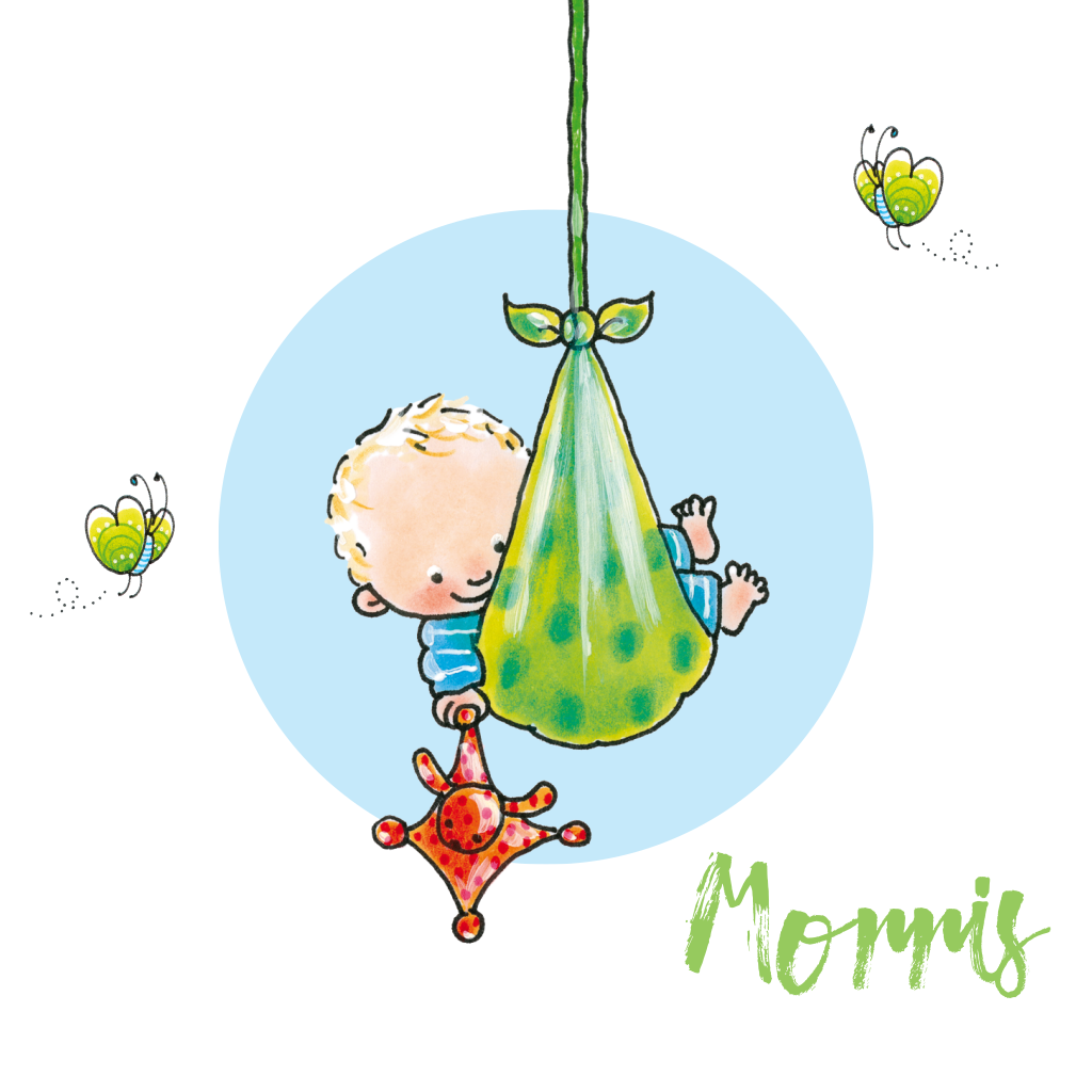 Wat een schattig geboortekaartje! De vlindertjes fladderen vrolijk om de getekende baby in de doek heen. Schrijf de naam van jouw kindje erbij.