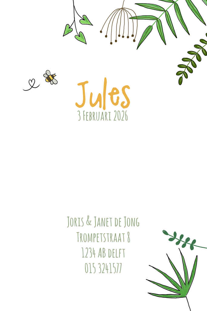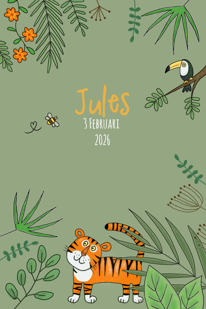 Een hip jungle geboortekaartje voor een jongen met tijger, toekan en planten op een donkergroene achtergrond. De kleuren en teksten kunnen in de editor aangepast worden.