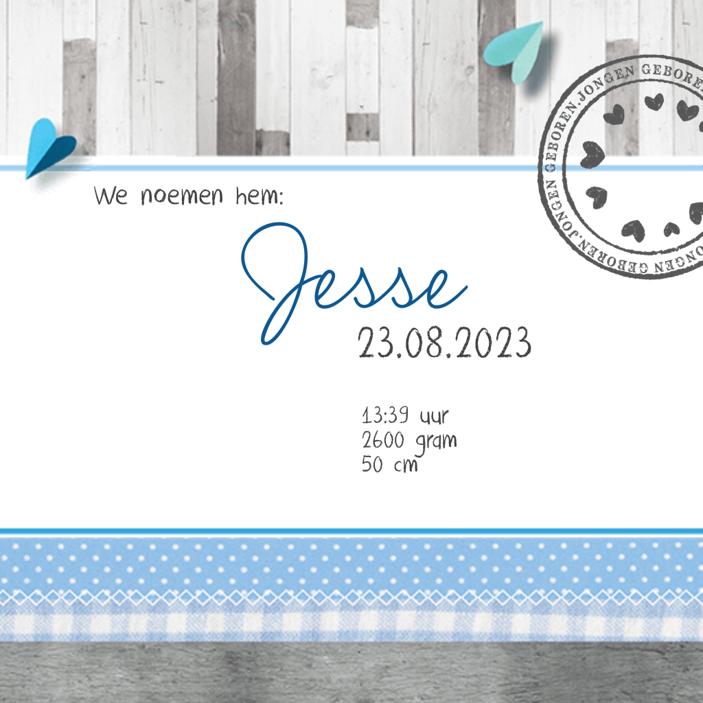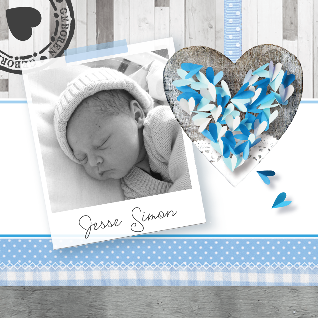 Vrolijke geboortekaart voor jongen met klassieke ruitjes en stoer hout met een geboortestempel en gevouwen papieren hartjes en een polaroid waar jij de foto van je baby in kunt zetten.