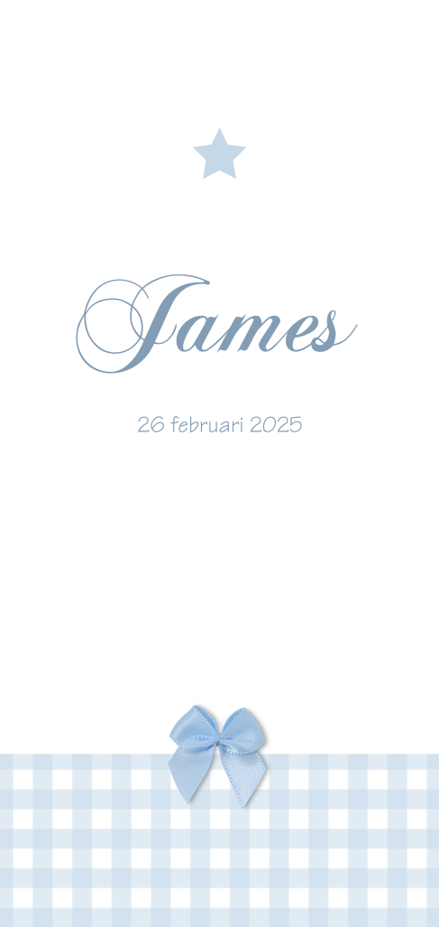 Een leuk klassiek geboortekaartje voor een jongen in een trendy langwerpig formaat. Met lieve ruitjes en een hippe echte strikje!