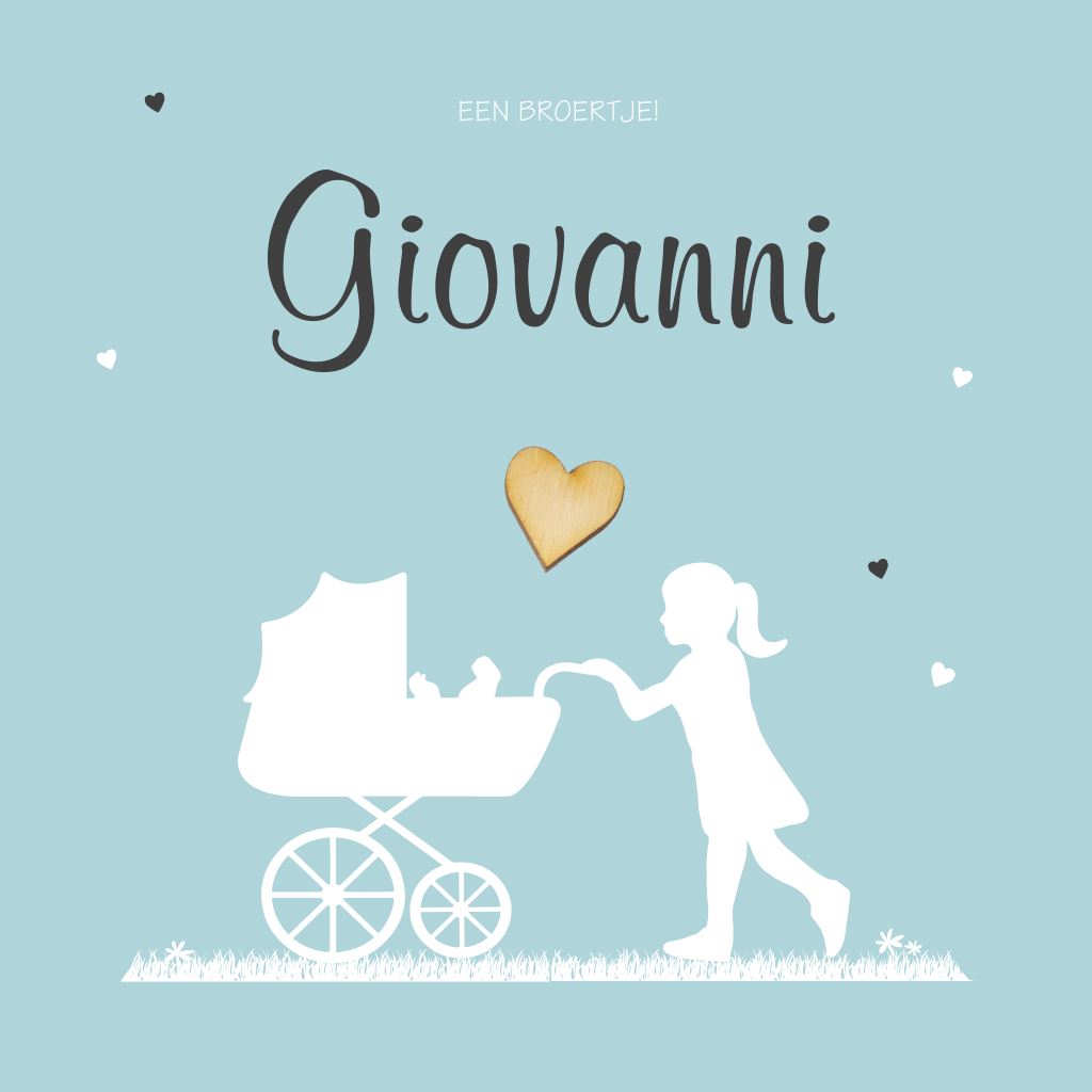 Hip geboortekaartje voor je zoontje met silhouet van grote zus met haar kleine broertje in de kinderwagen. Het echte houten hartje maakt dit kaartje helemaal af!
