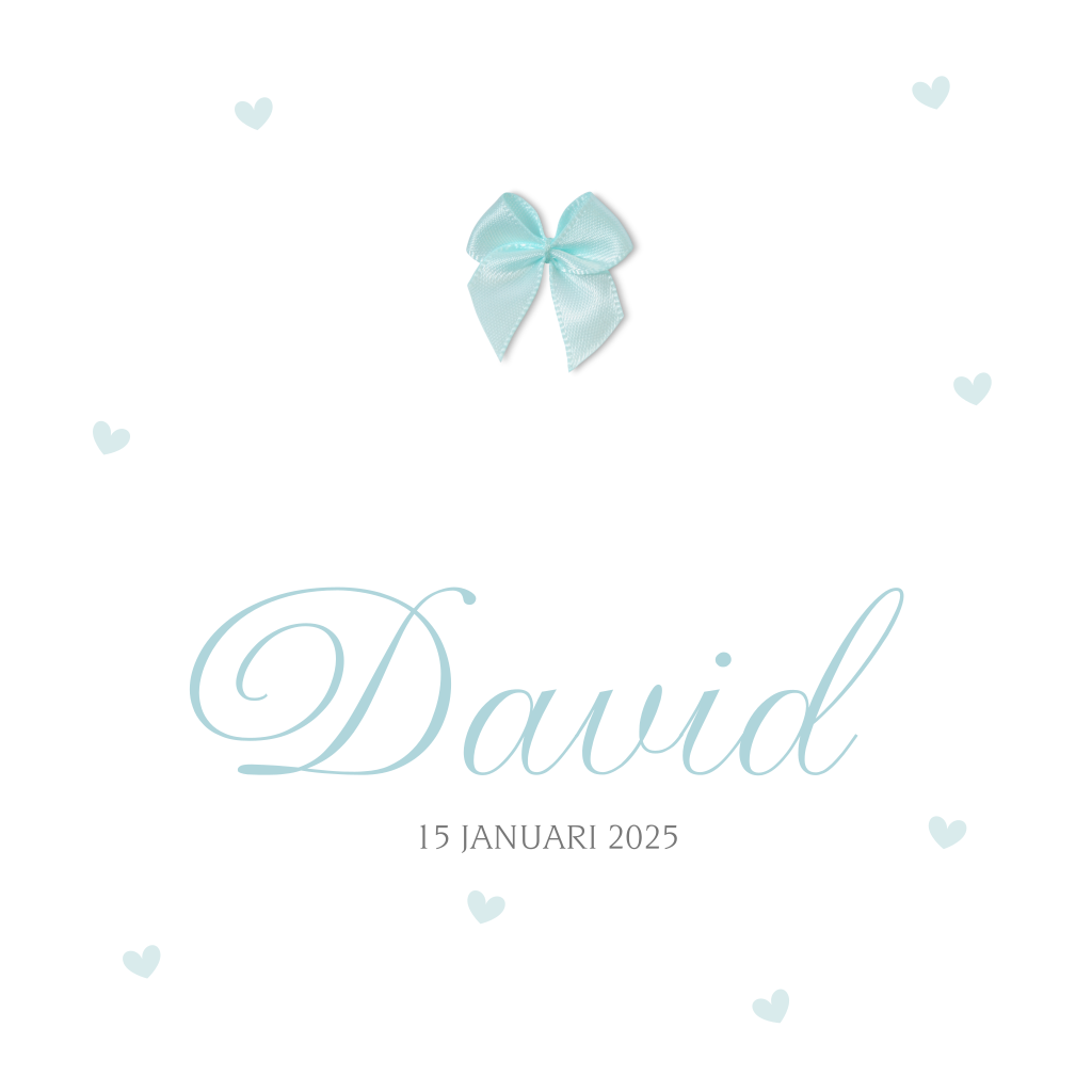Romantisch geboortekaartje voor een jongen met blauwe hartjes en sierlijke typografie. Het echte blauwe strikje maakt dit kaartje heel hip! Pas de kleuren en lettertypen aan naar wens in de editor.