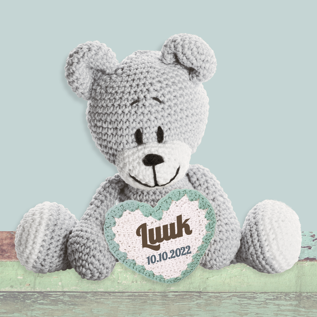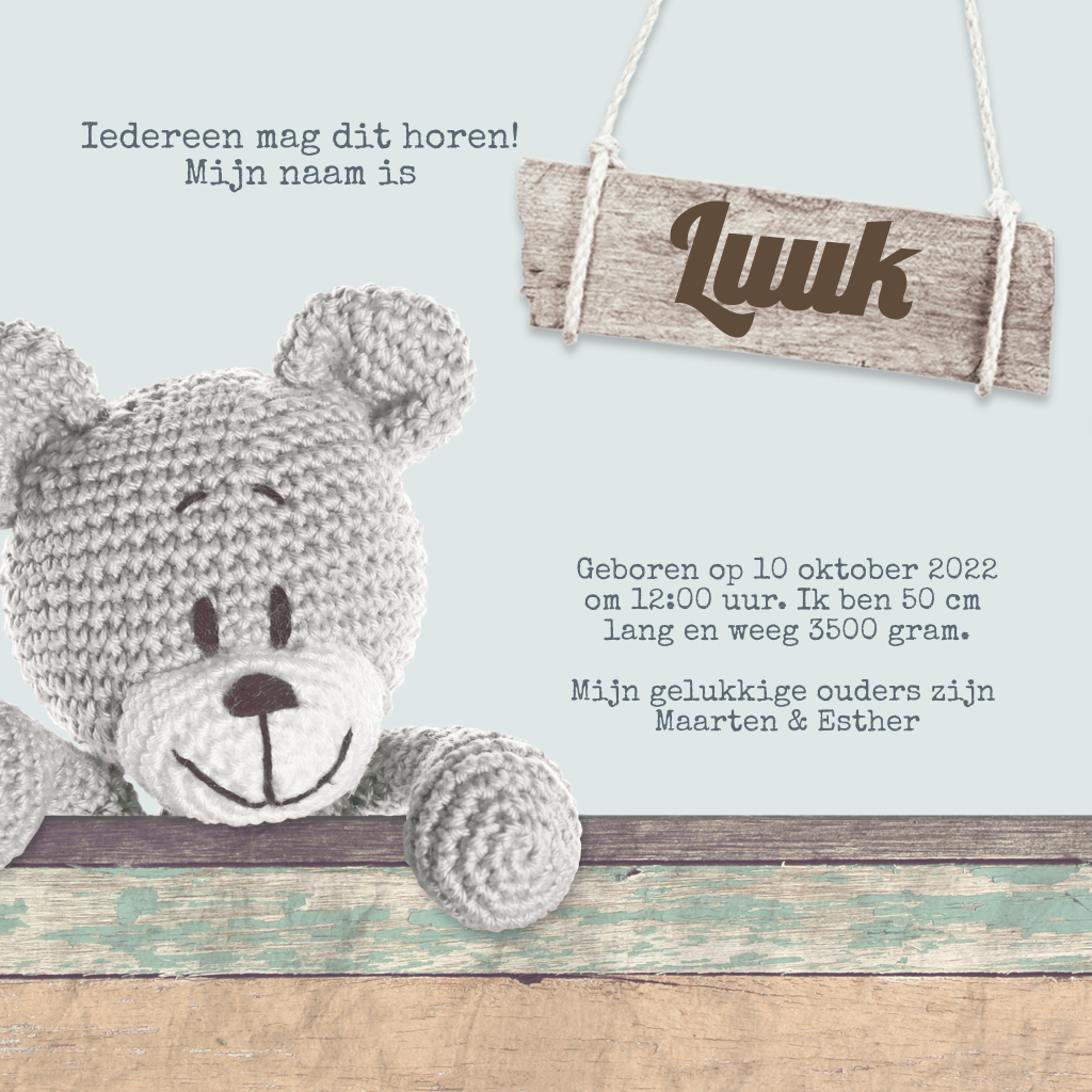 Een gebreide knuffelbeer met een hartje in zijn hand, wat lief! Het lijkt net alsof het beertje op de houten planken van de achtergrond zit. Zet de naam van jouw kleine zoontje in het hartje en maak hier jouw eigen geboortekaartje van!