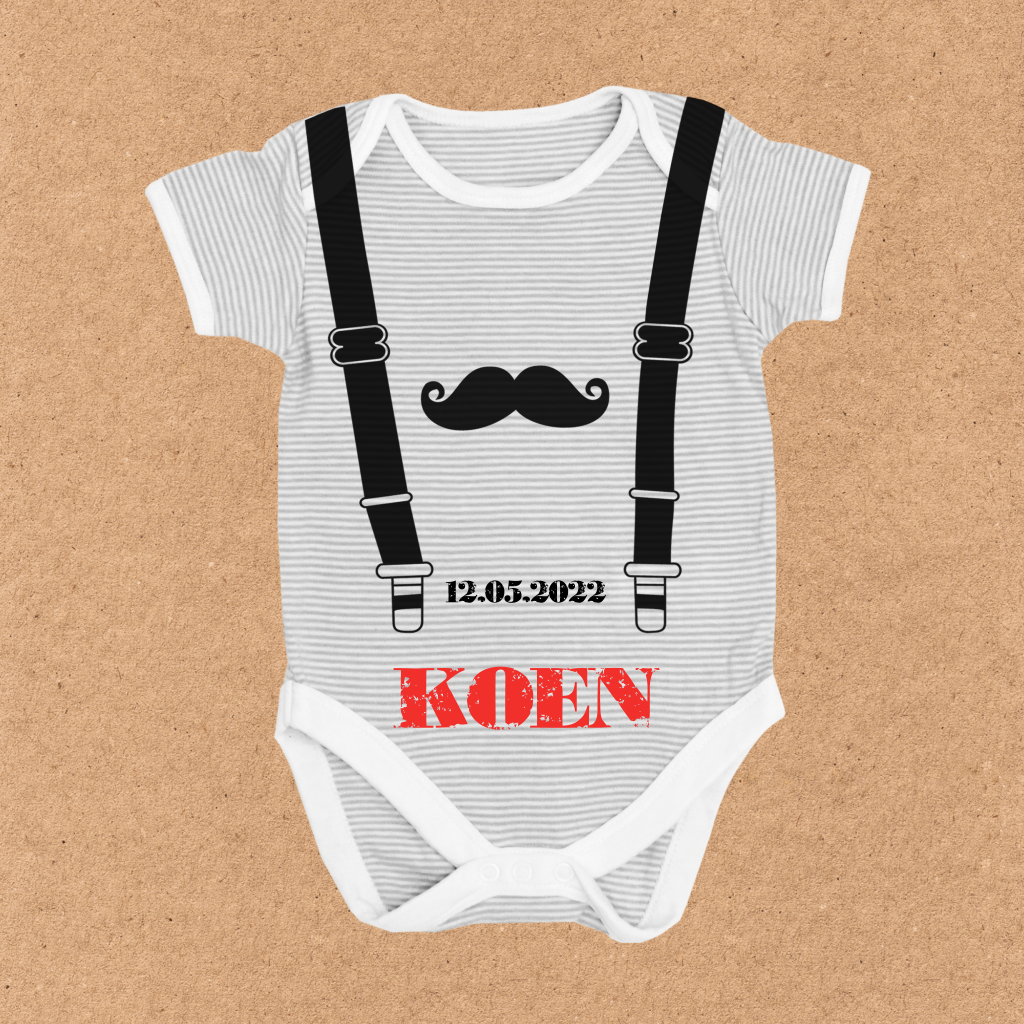 Wat een hippe geboortekaart met een achtergrond van kraftpapier! Bijzonder aan dit kaartje is het rompertje met de stoere snor en fancy bretels. Leuk voor een klein ventje!