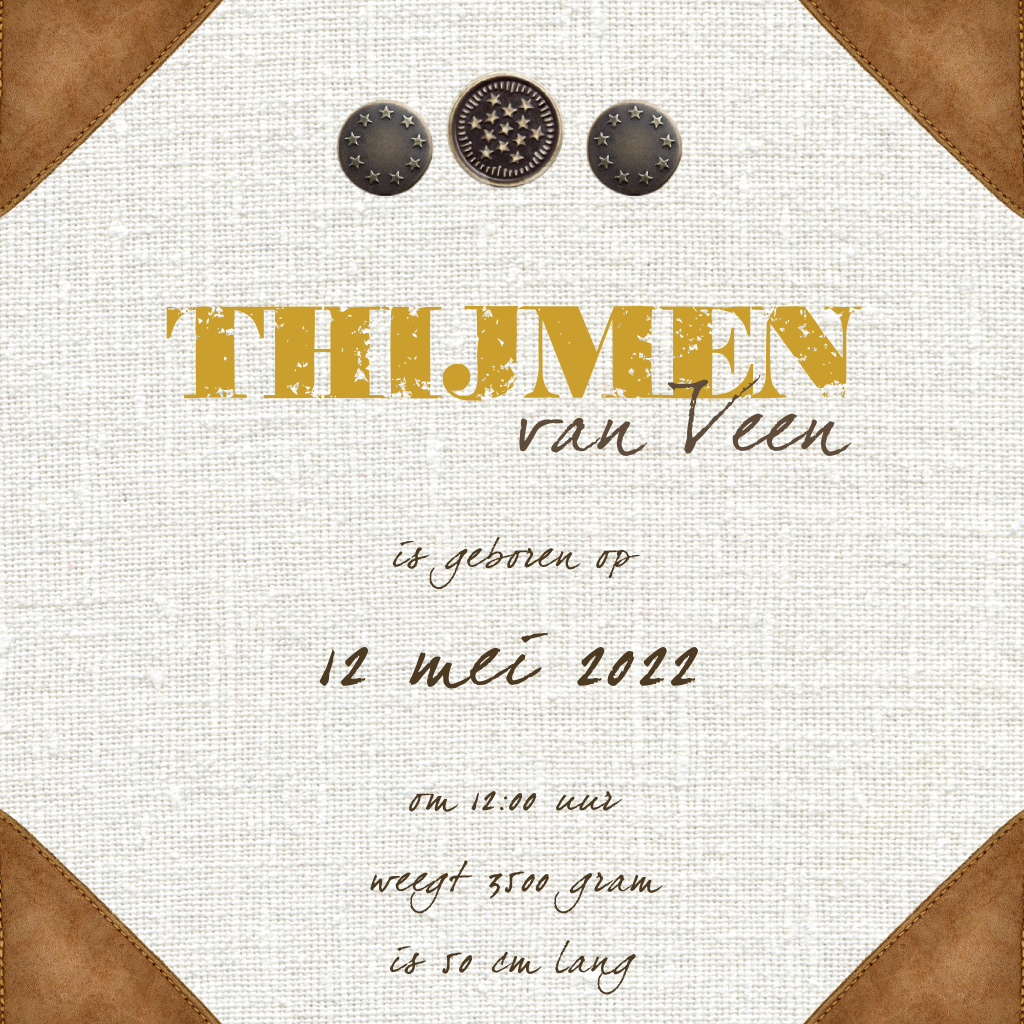 Dit geboortekaartje in retro-stijl heeft een stoere legerprint, drukknopen met sterren en hoeken van stof. Leuk voor een jongen!