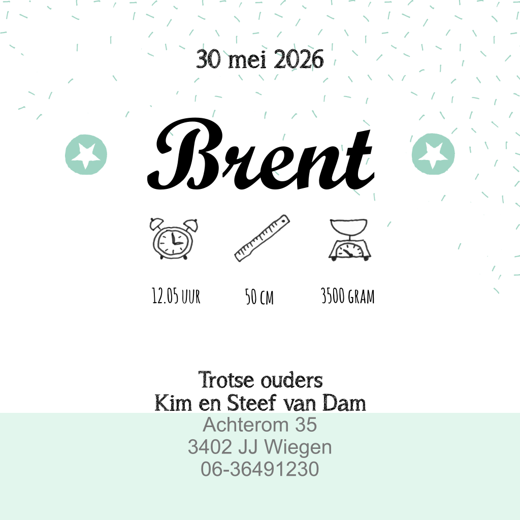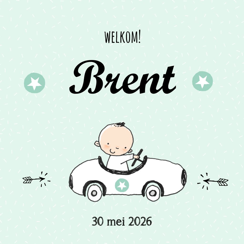 Schattig geboortekaartje voor je pasgeboren zoontje met een tekening van een jongetje in een race auto op mintgroene achtergrond.