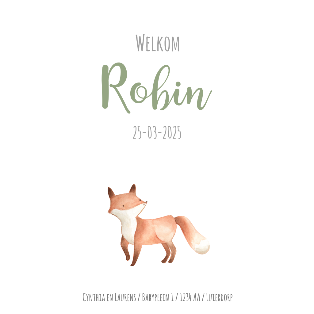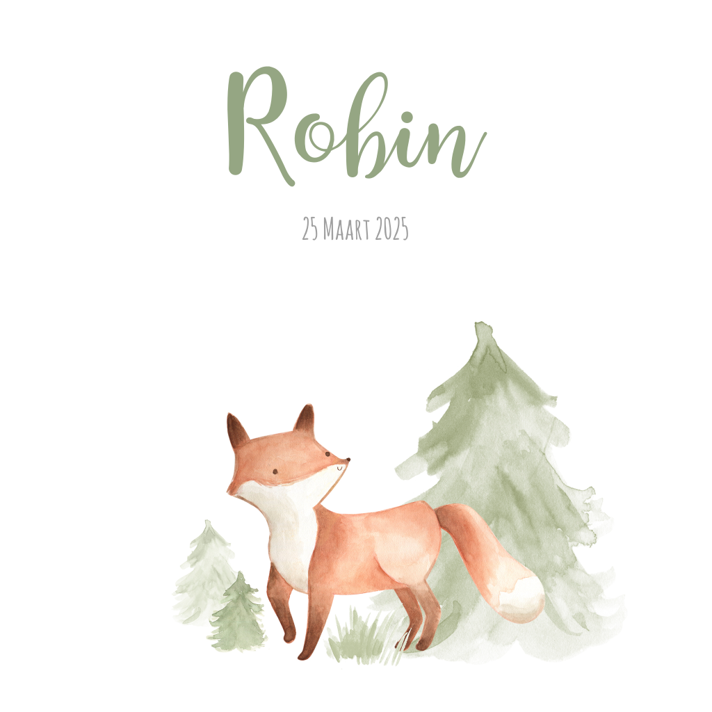 Lief geboortekaartje voor een jongen! Speciaal aan dit kaartje is het vosje dat vaker terug komt op de kaart. Met bomen en bloemenkrans in waterverf!