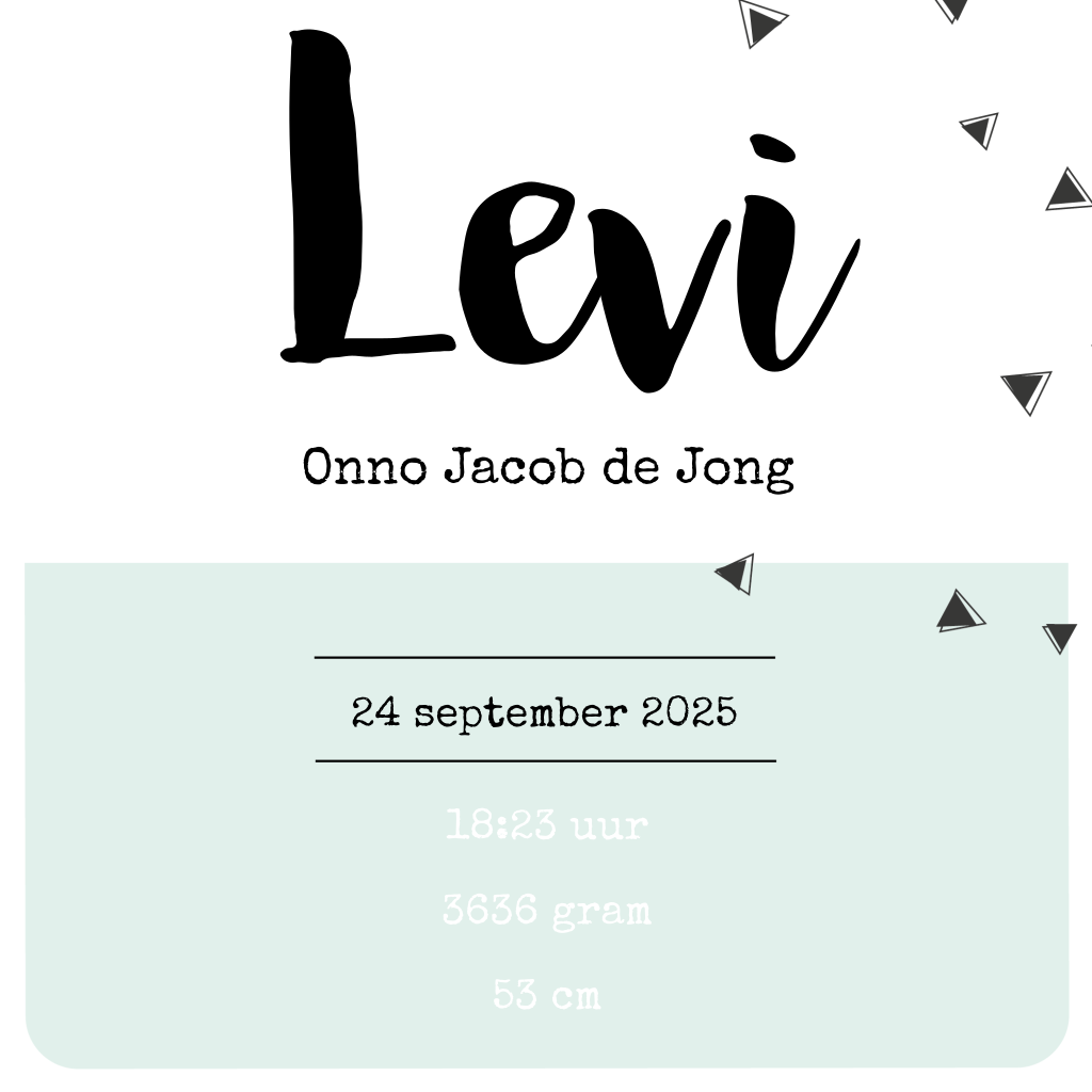Allemaal driehoekjes en een mintgroene achtergrond: wat een trendy geboortekaartje! Dit kaartje is ontworpen door Tante Kaartje en is leuk voor een jongen.