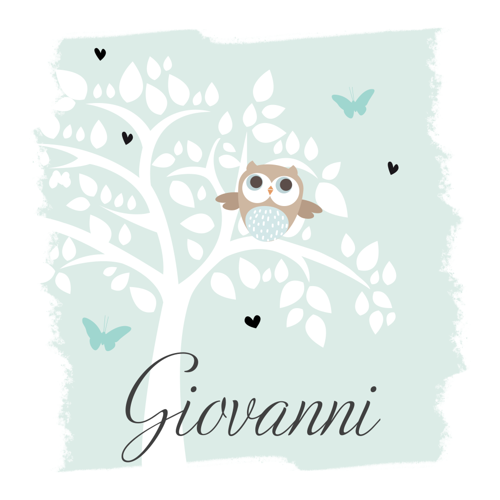 Romantisch geboortekaartje voor een jongen met mint achtergrond en silhouet van een boom. Het thema 'dieren' zie je terug aan de uil en vlinders.