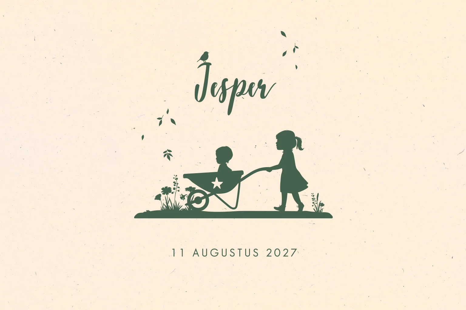 Geboortekaartje voor een baby broertje van duurzaam papier met een silhouet tekening in groen, dat mooi past bij het eco papier. Grote zus duwt de kruiwagen met haar kleine broertje door een landschap. Op de naam in hippe letters zit een vogeltje, grappig toch?!