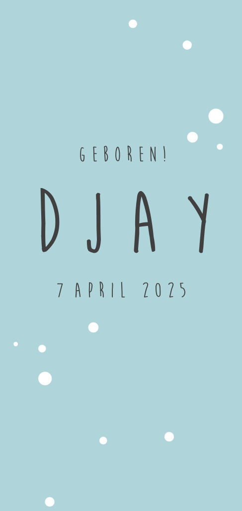 Stoer geboortekaartje voor een jongen met witte stippen op een blauwe achtergrond en een foto. Pas de kleuren en lettertypen aan naar wens in de editor.