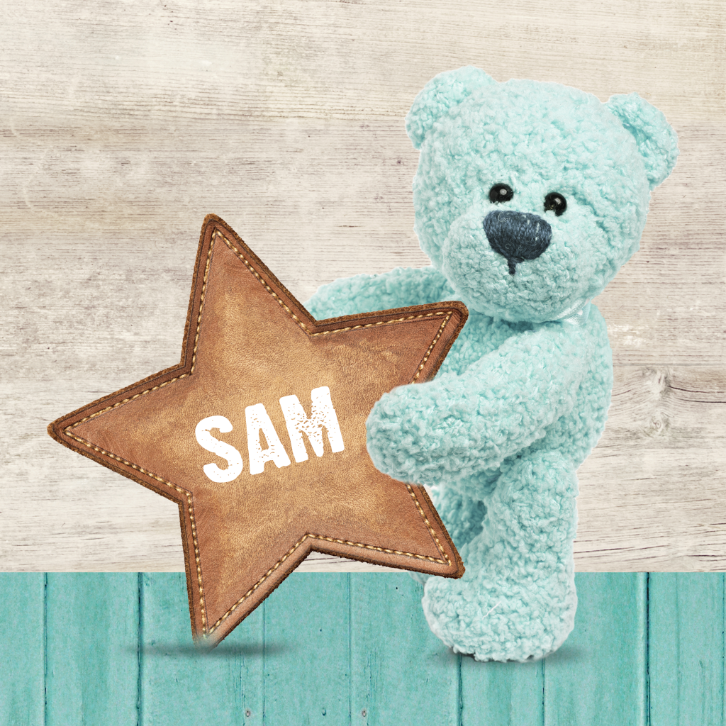 Wat een lief geboortekaartje met deze aaibare, lichtblauwe knuffelbeer! Het beertje heeft een grote, bruine ster vast, waarin je de naam van jouw kleintje kunt zetten. In combinatie met de lichtbruine en groenkleurige houtplanken op de achtergrond is dit kaartje helemaal compleet!