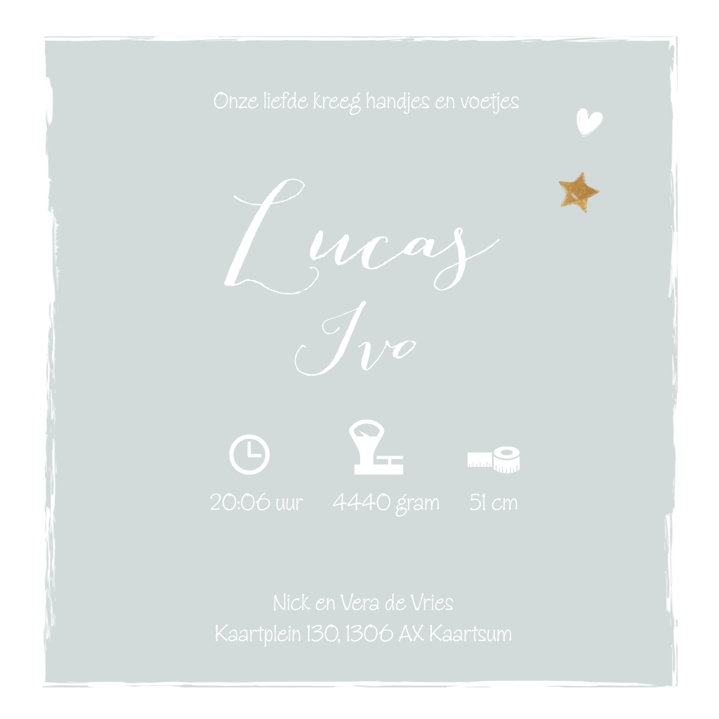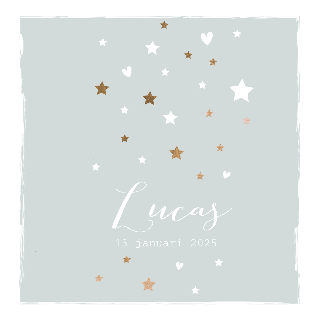 Klassiek geboortekaartje voor een jongen met sterren en hartjes en een naam in handlettering. Om het kaartje zit een mooi wit kader.