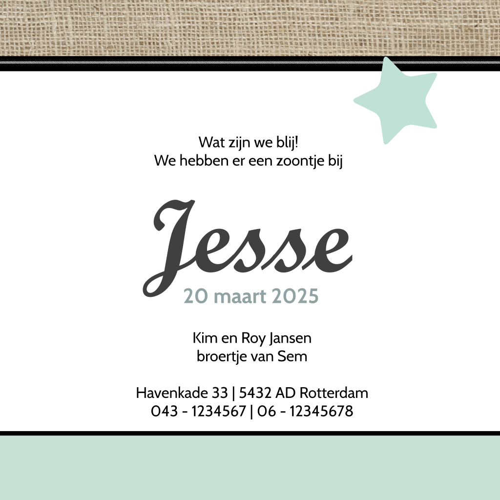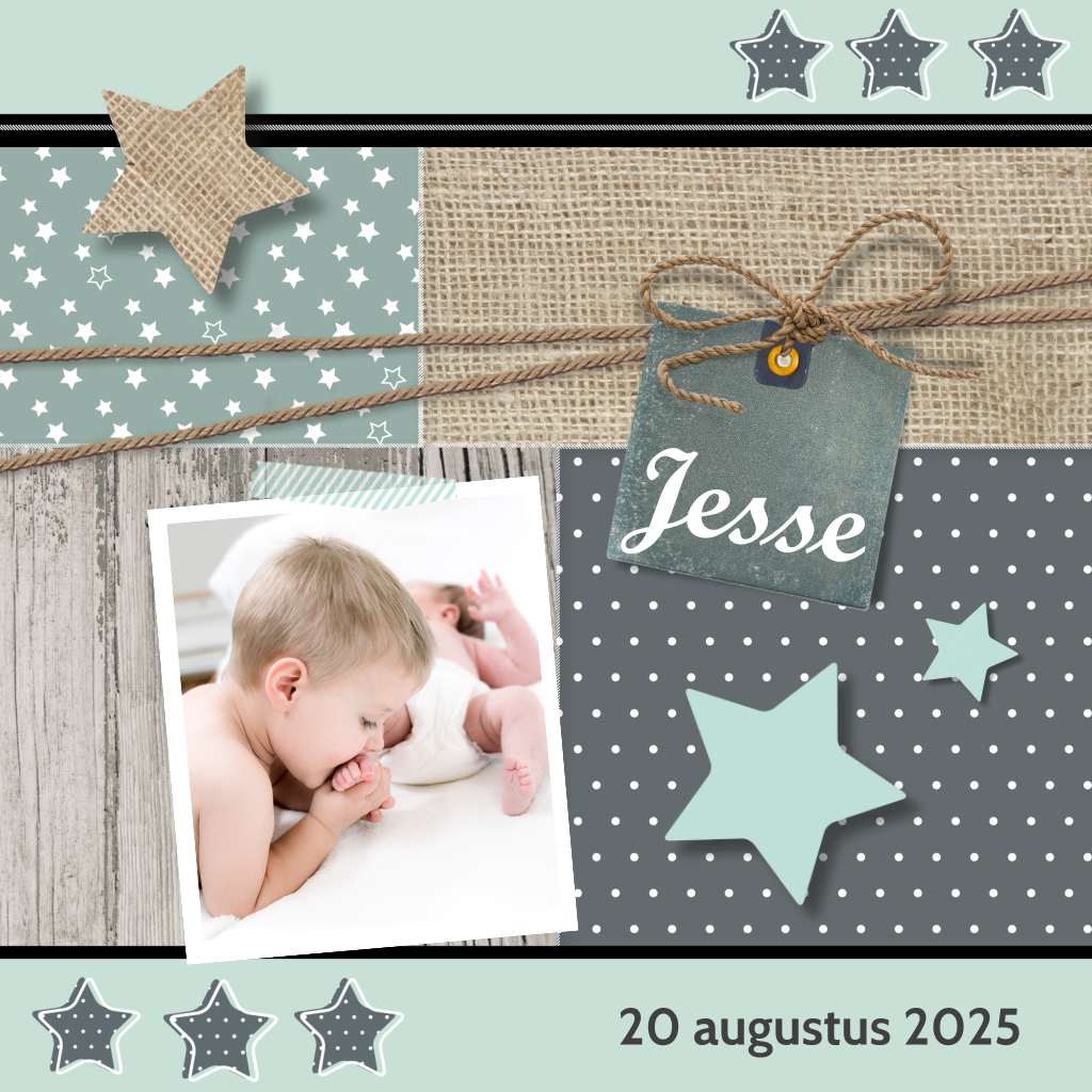 Geboortekaartje met jute en sterretjes voor jongen