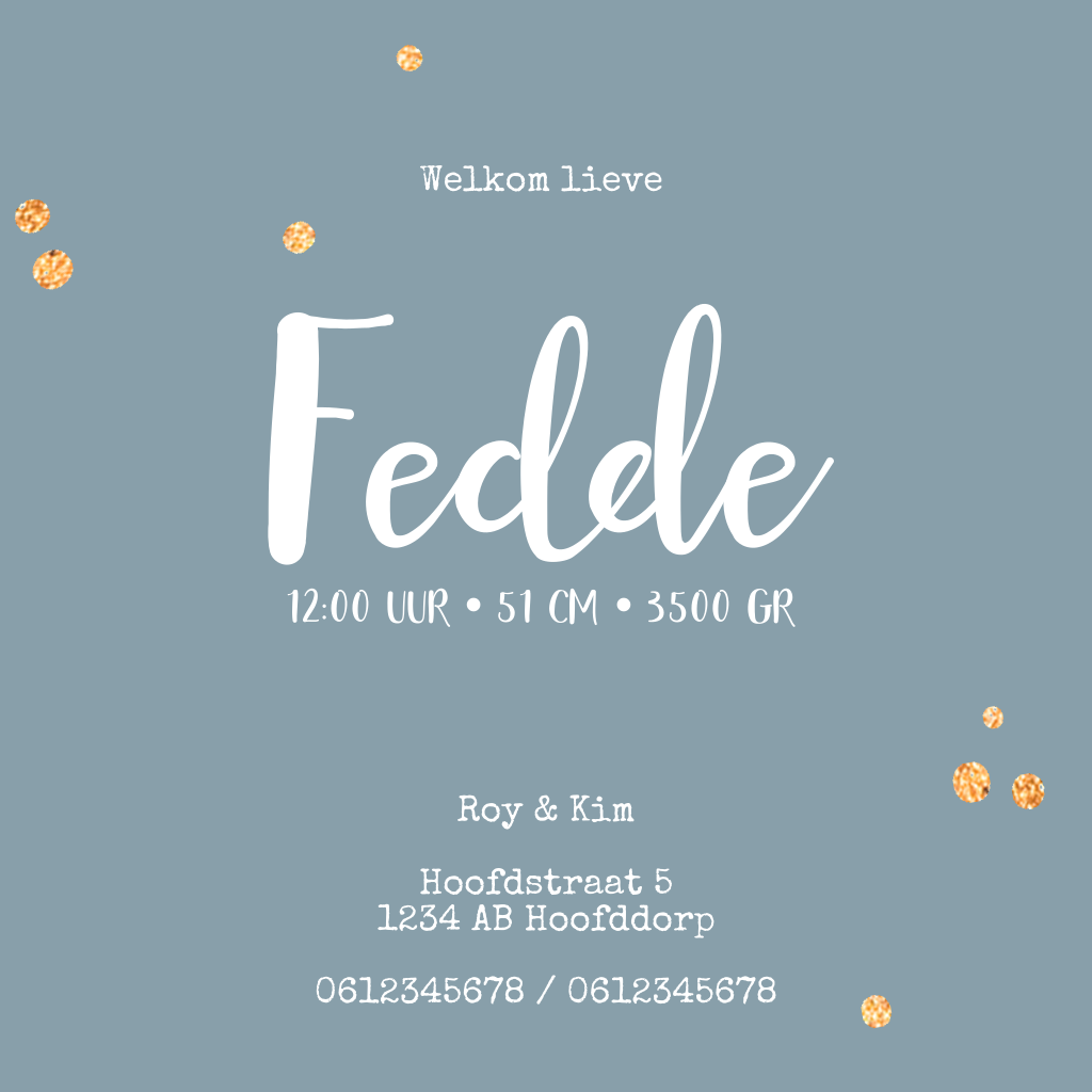 Hip geboortekaartje met goudkleurige stipjes. De goudlook maakt dit simpele geboortekaartje lekker vrolijk. Dit is echt wat voor hippe ouders die in verwachting zijn van een jongetje.