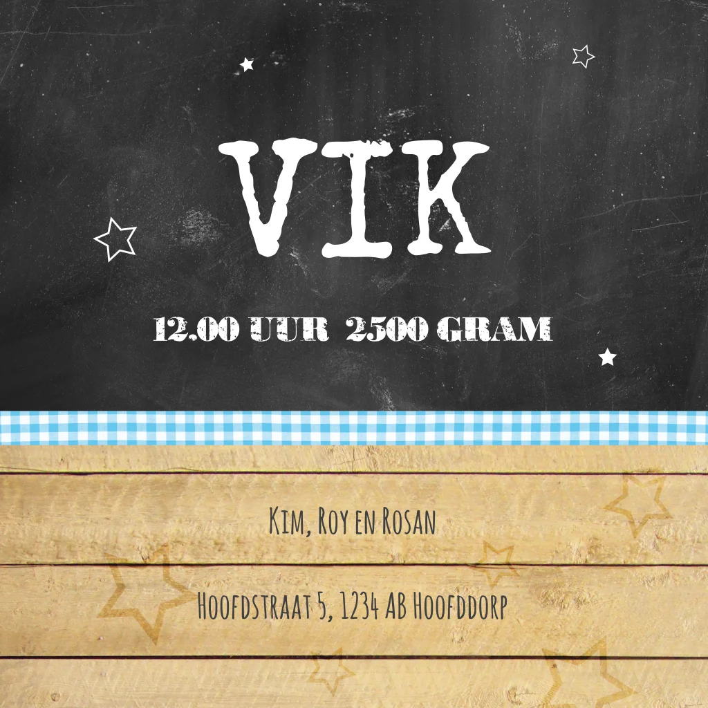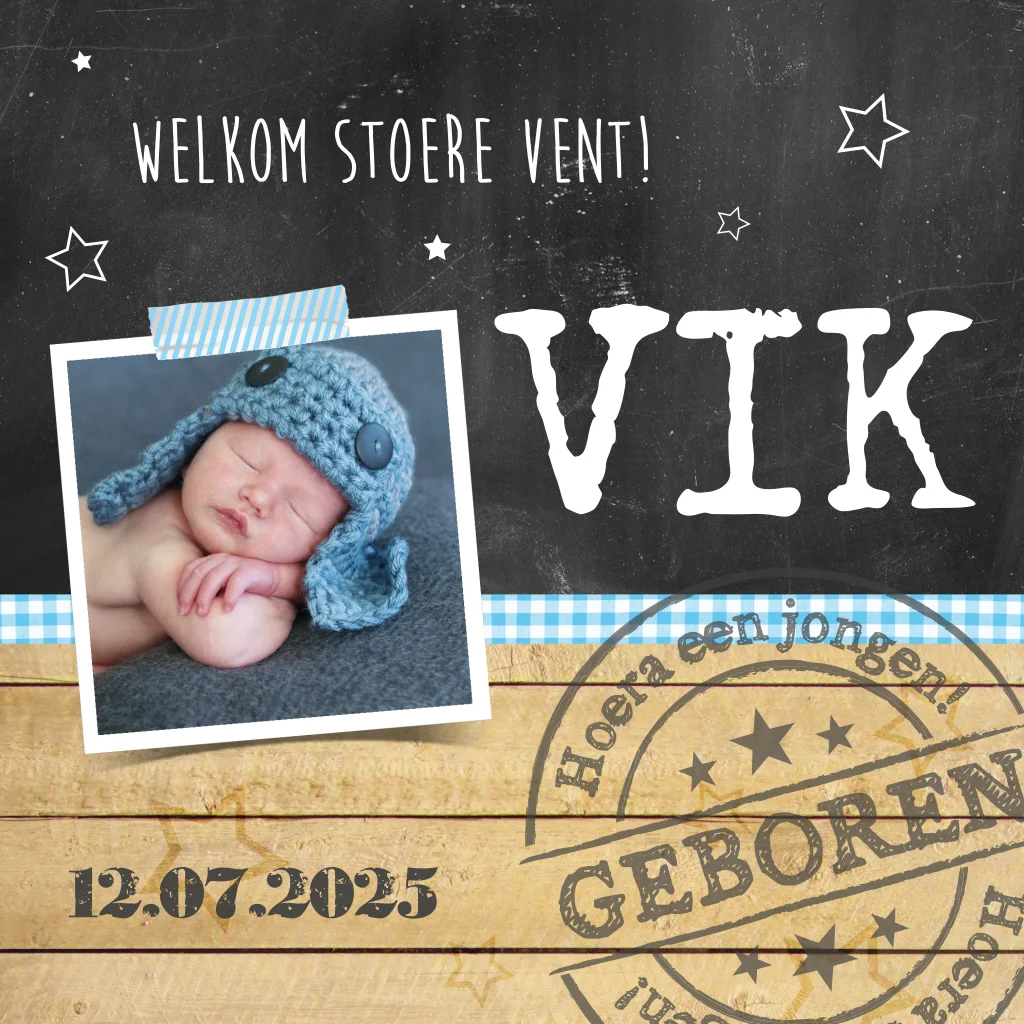 Stoer geboortekaartje voor een jongen met krijtbord achtergrond en een hippe stempel. Plaats op de voorkant een mooie foto van de kleine man zodat iedereen hem kan bewonderen.