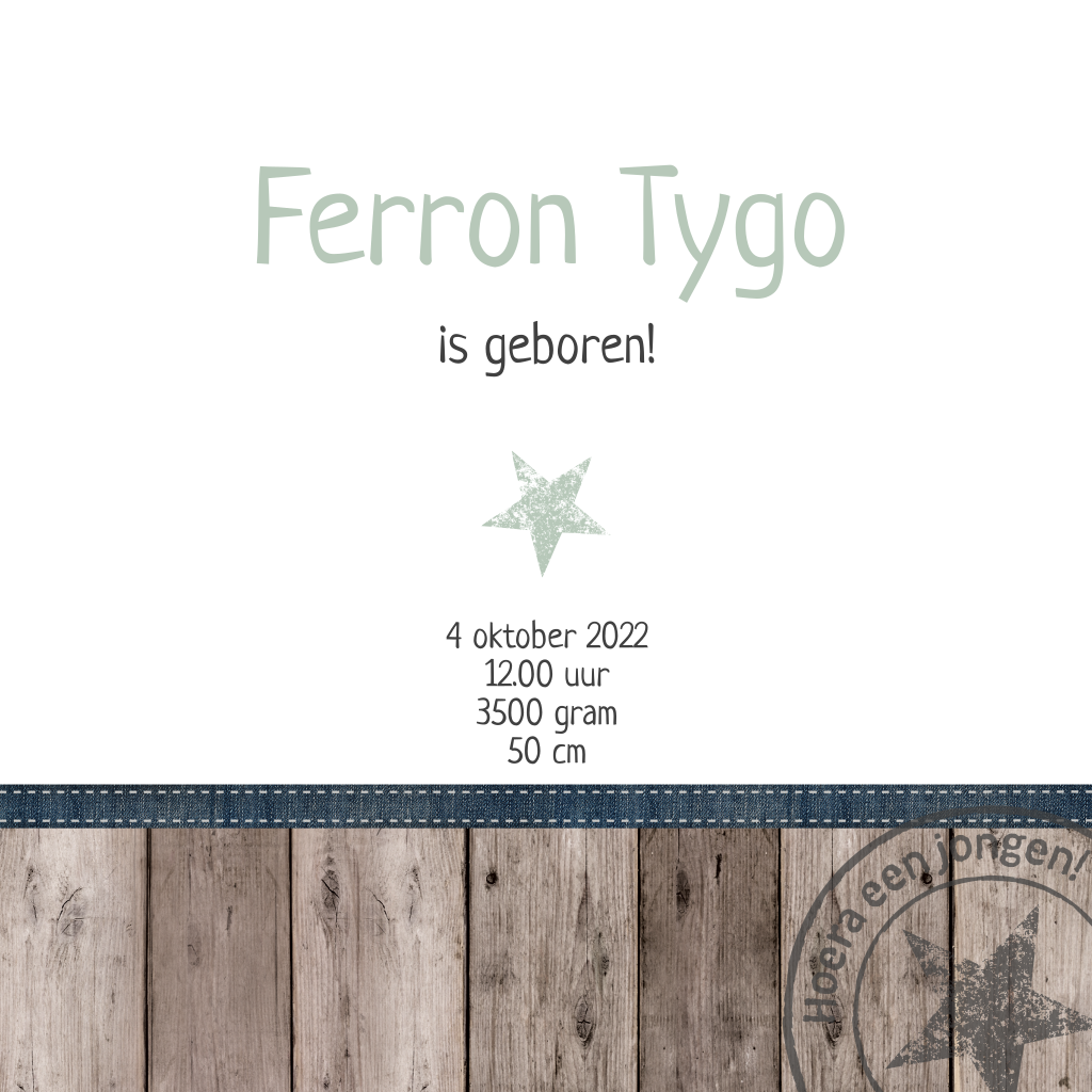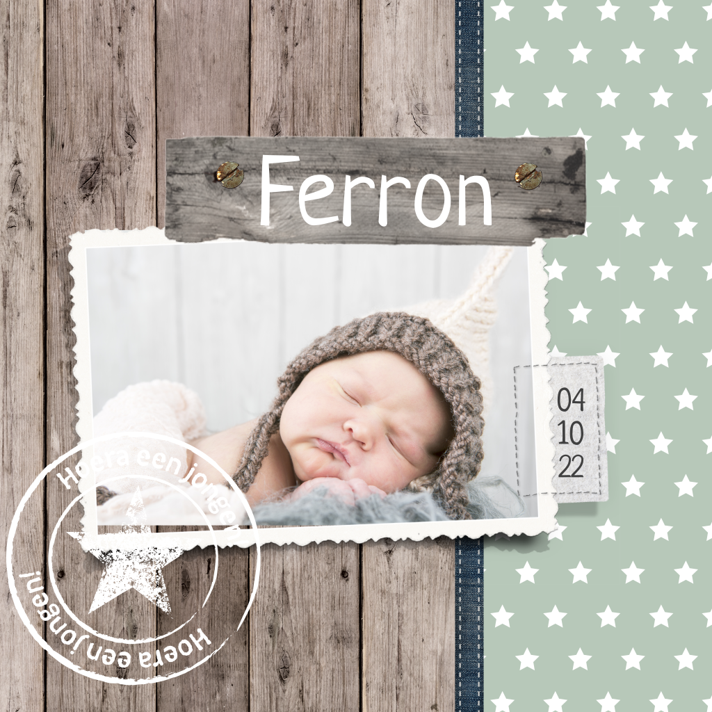 Stoer kaartje voor de geboorte van je zoon met hout en sterren achtergrond in mint groen. De foto kan makkelijk in de editor aangepast worden. De geboortestempel maakt deze kaart helemaal af!