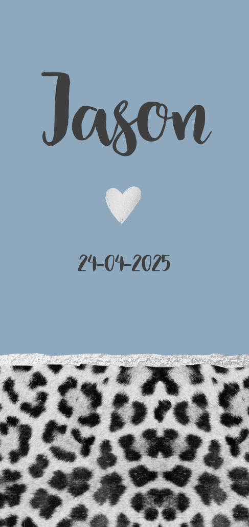 Een stoer babykaartje voor een jongen met panterprint en hartje. Pas zelf de tekst aan in de editor. De blauwe achtergrondkleur is ook aanpasbaar.