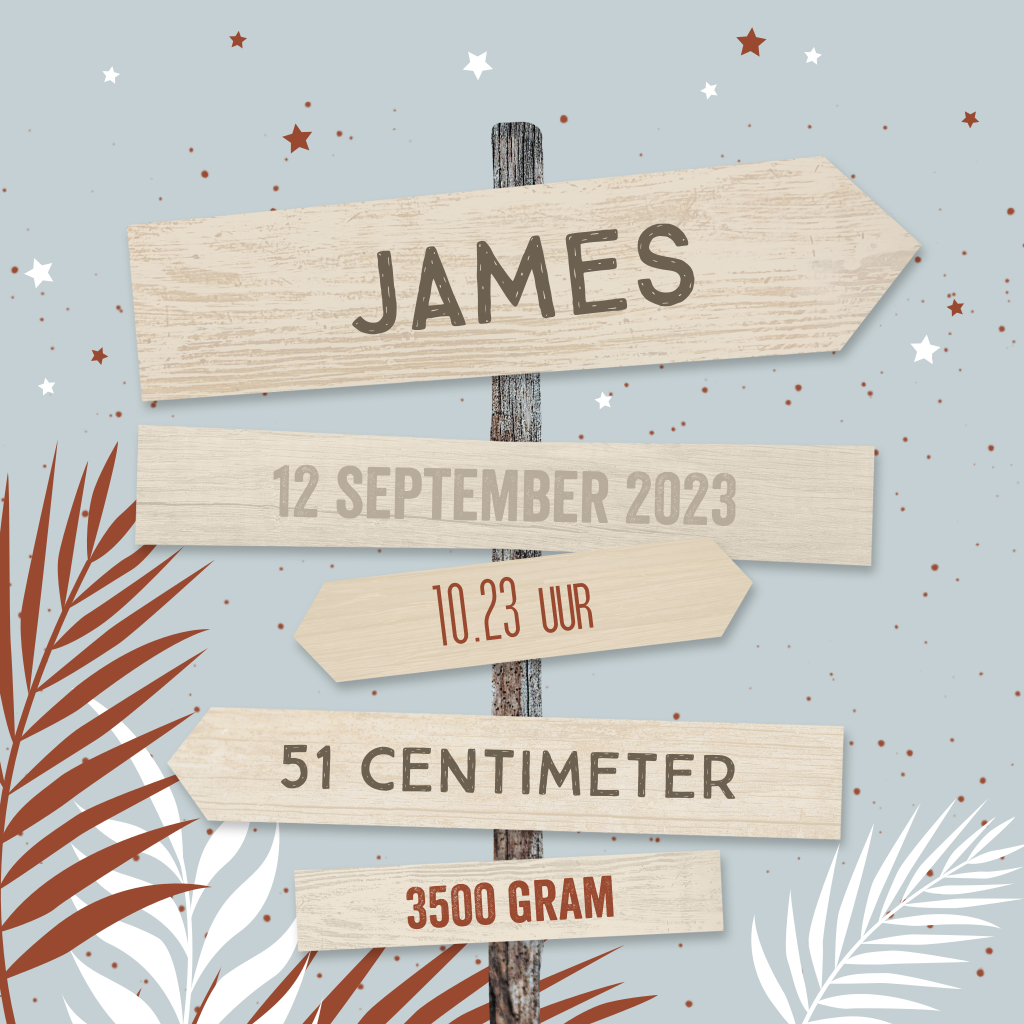 Op zoek naar een stoer geboortekaartje voor je zoon? Dan is dit kaartje met strandpaal, witte en rode bladeren en sterretjes echt wat voor jou! Het kaartje heeft een mooie lichtblauwe achtergrond. De tekst op de bordjes pas je eenvoudig aan in de online editor.