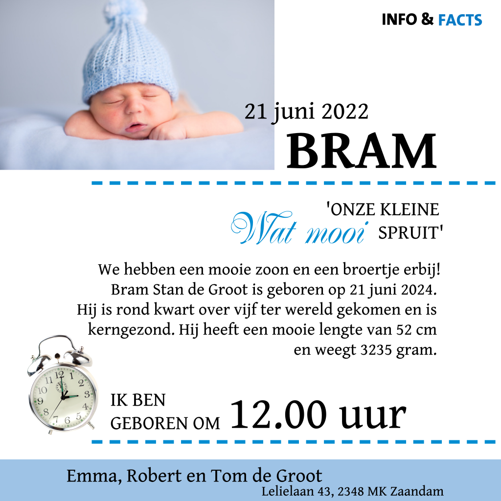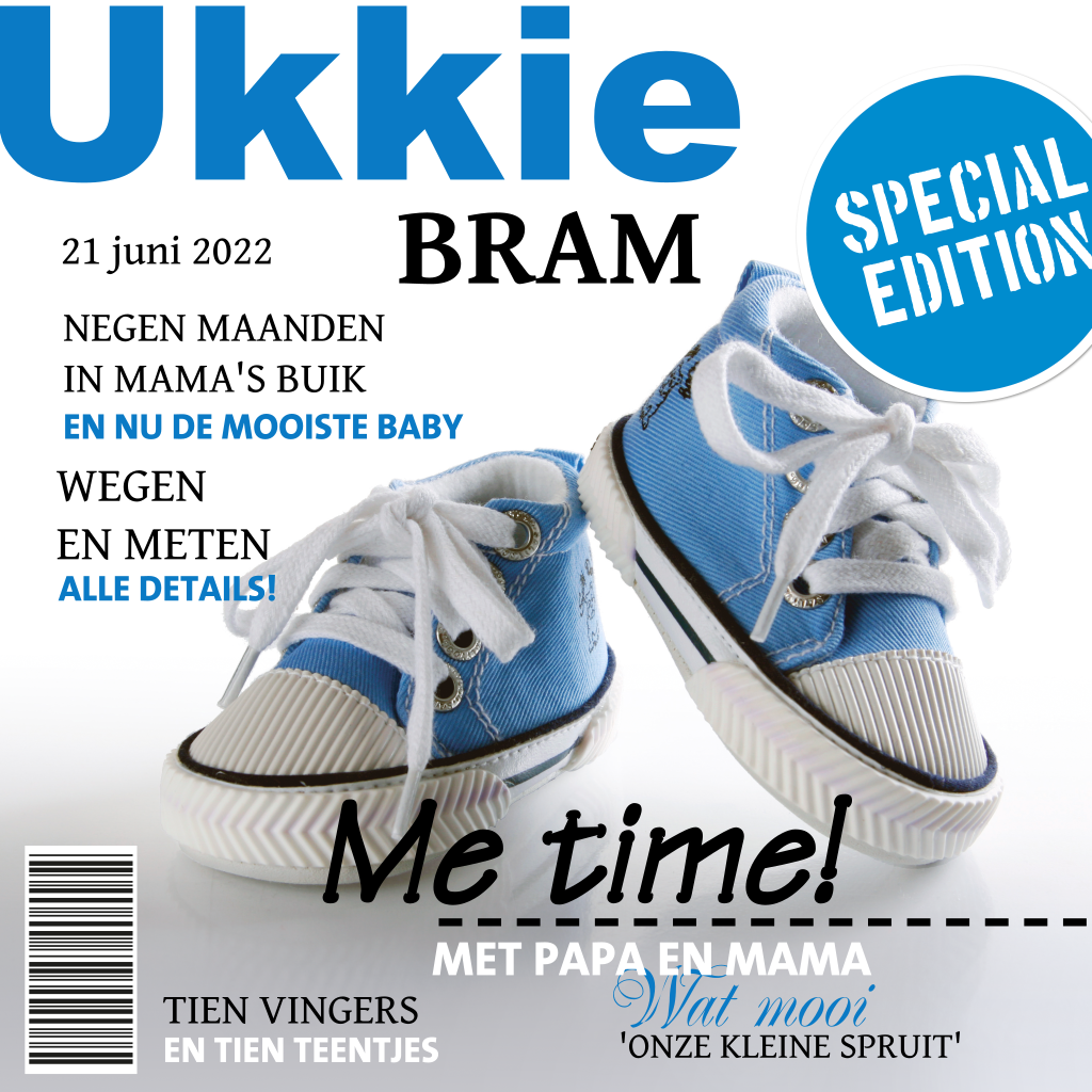 Een super originele geboortekaart voor jouw kleintje! De hele kaart is ontworpen alsof het een tijdschrift is. Op de voorkant zie je lieve babyschoentjes en aan de binnenkant van de kaart kun je ook een foto toevoegen. De teksten en kleuren kun je nog geheel naar wens aanpassen in de online-editor.