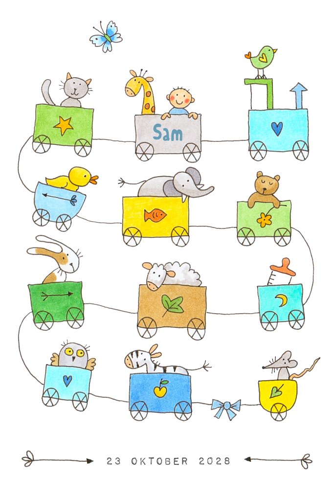 Een vrolijk en origineel geboortekaartje voor een jongen met een trein met getekende dieren in felle kleuren.