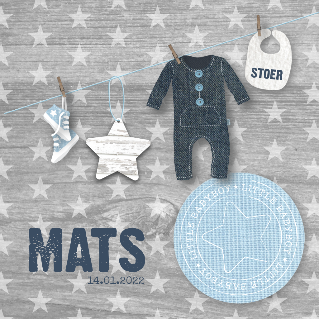 Een stoer geboortekaartje met een waslijn, sterren en houtprint voor een jongen! De losse onderdelen kun je verschuiven en vergroten of verkleinen.