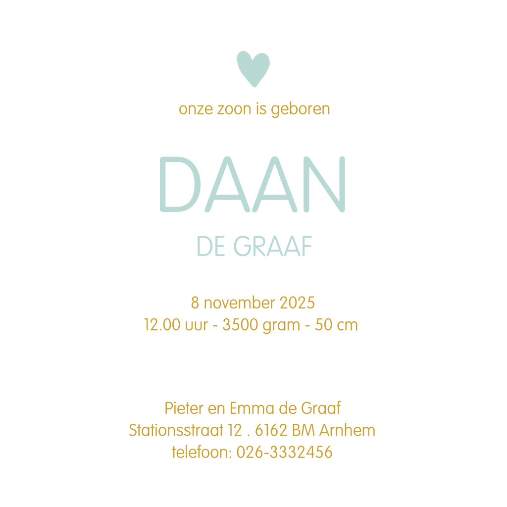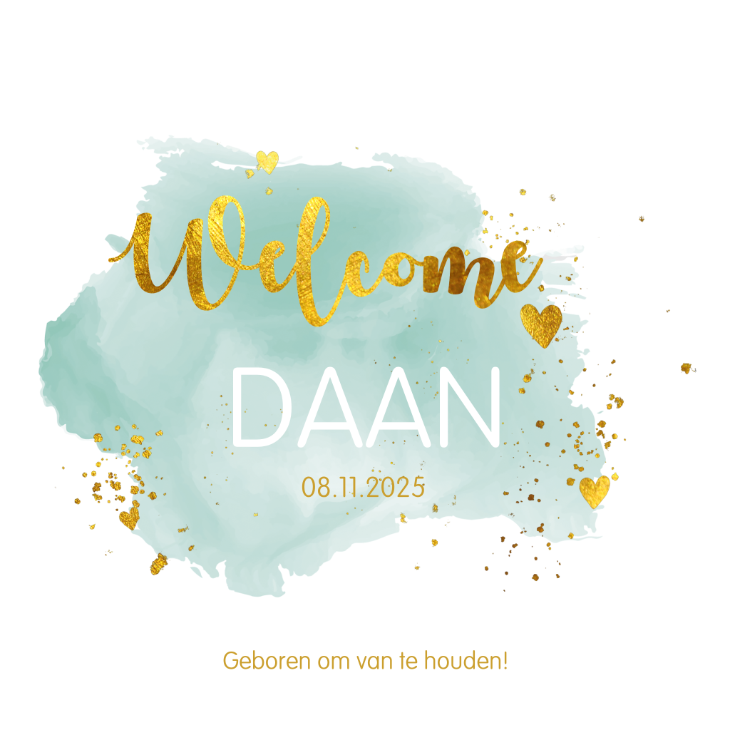 Een stijlvolle geboortekaart voor een jongen! Met groene watercolour en goudkleurige verspetters, hartjes en geschreven letters. Geboren om van te houden! Combineer deze kaart bijvoorbeeld met een goudkleurige of witte envelop.