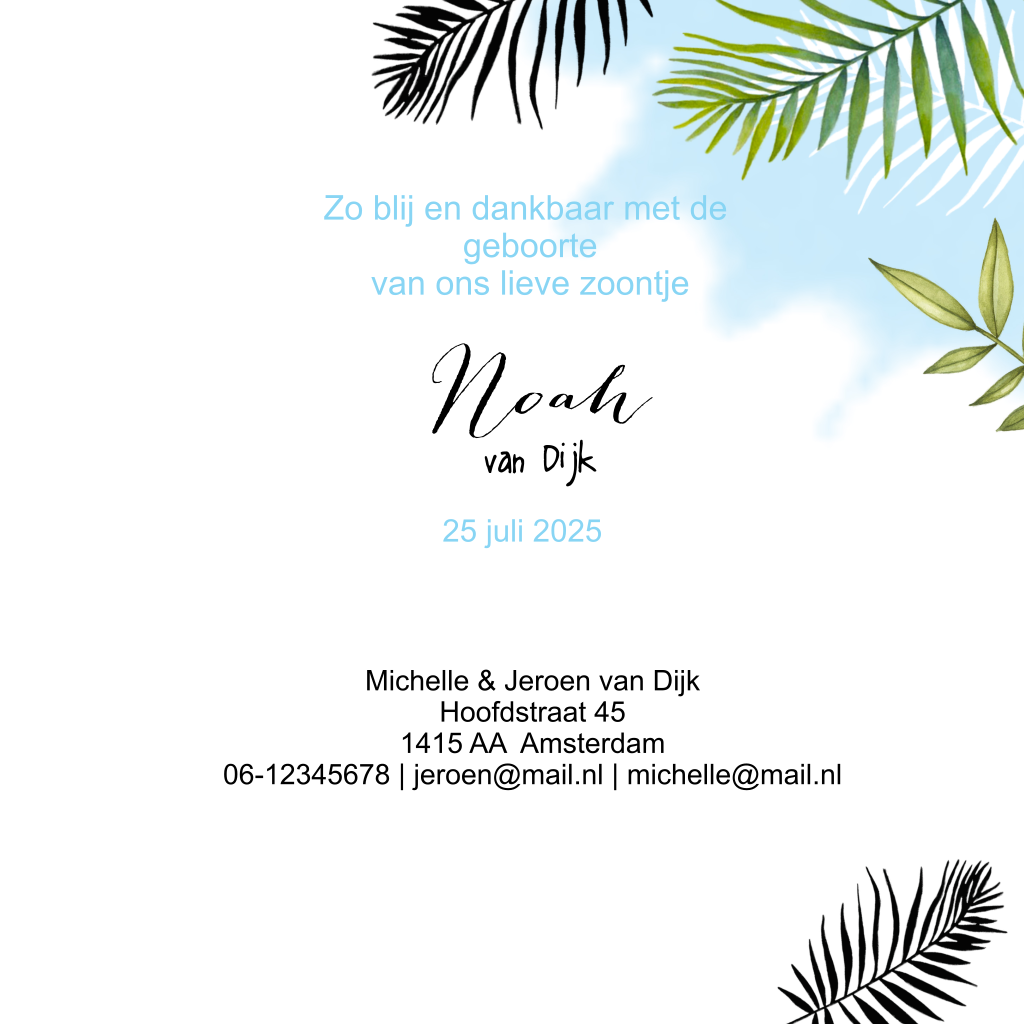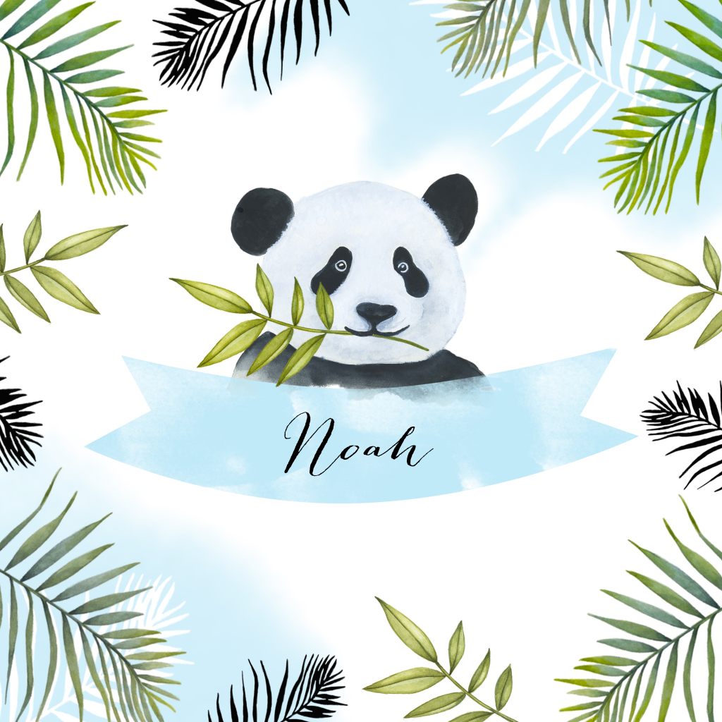 Hippe geboortekaart met panda beer en botanische bamboe takjes gecombineerd met zacht blauwe verf. Echt een stoer kaartje voor je zoontje!