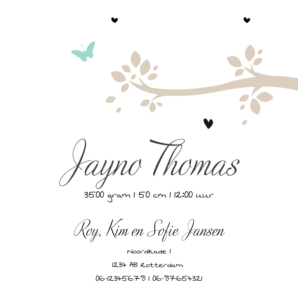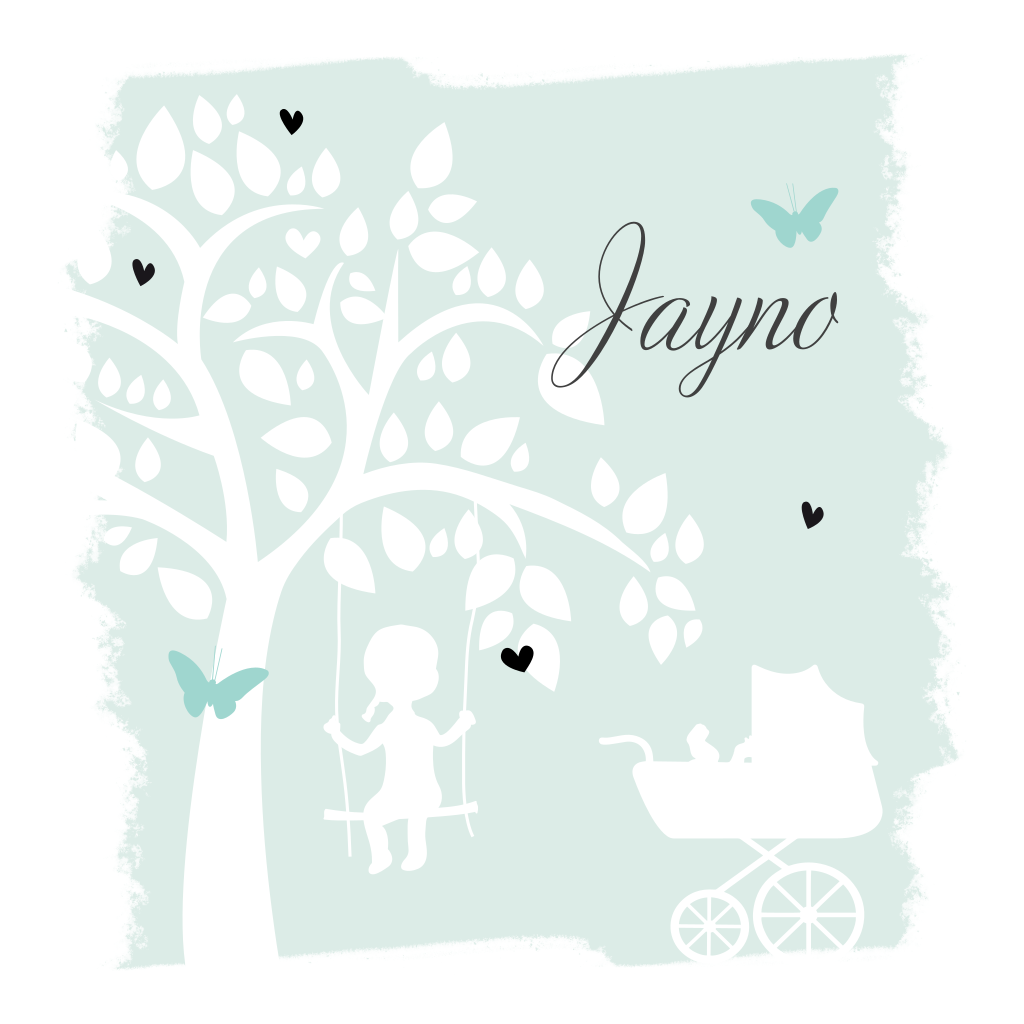 Vrolijk geboortekaartje voor je zoontje met een silhouet van grote zus die onder een boom aan het schommelen is en haar kleine baby broertje die in de kinderwagen ligt.