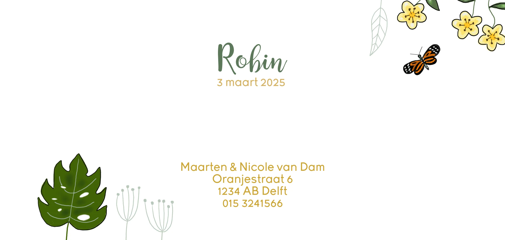 Een hip jungle geboortekaartje op een panoramakaart, met luiaard, toekan, kameleon, vlinder en een klein bijtje.