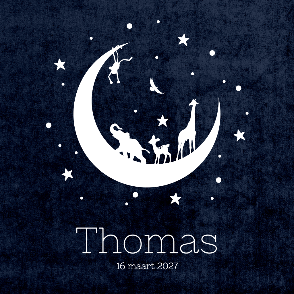 Vierkant geboortekaartje met een donkerblauwe velvet-achtergrond. Op het kaartje staat een grote maan en kleine sterren van goudfolie. Op de maan staan de silhouetten van een aapje, olifant, hertje en giraffe en erboven een vogel.