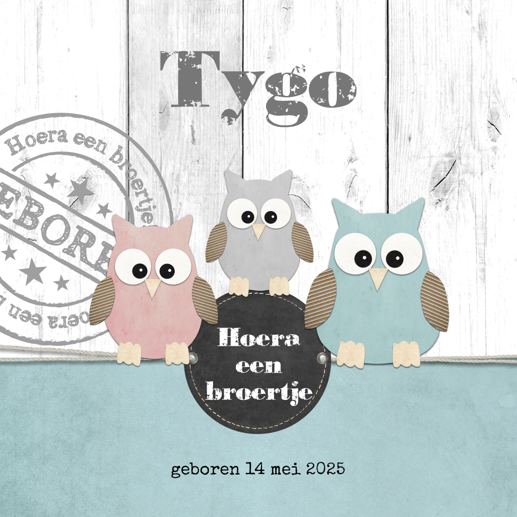 Schattig geboortekaartje voor de geboorte van jullie derde kind. De drie uiltjes staan op een houten achtergrond. De geboorte stempel geeft een stoere uitstraling aan deze kaart. Pas de tekst aan in de editor.