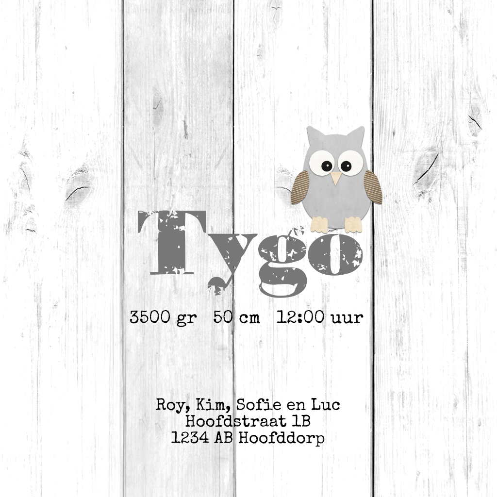 Origineel geboortekaartje met uiltjes en stempel op hout