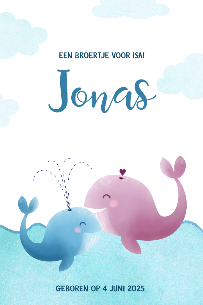 Een schattig geboortekaartje voor de geboorte van een broertje met walvisjes die aan het spelen zijn in de zee. In de editor kunnen de tekst en de lettertypes aangepast worden.