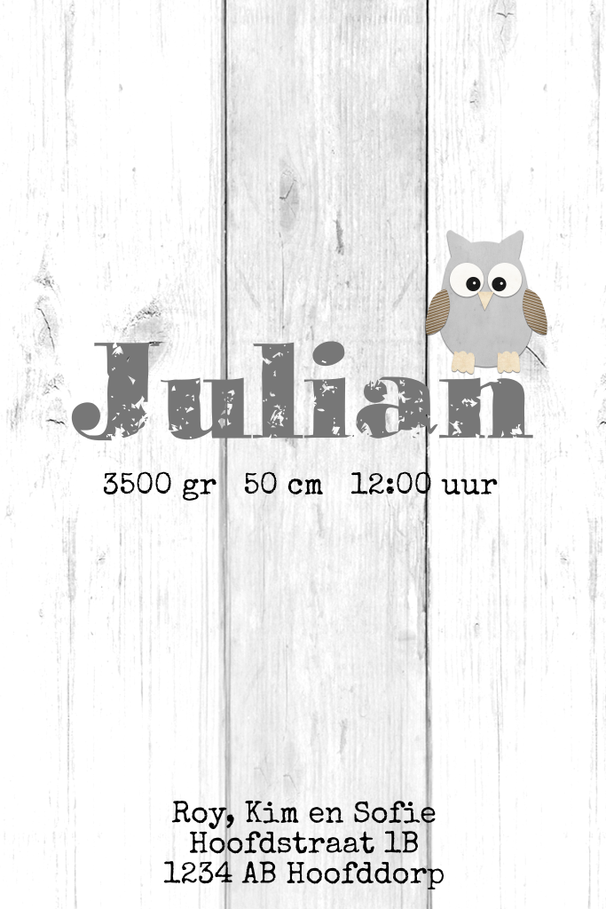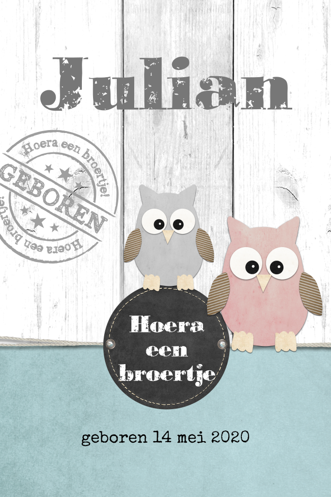 Leuke geboortekaart om de geboorte van je tweede kind aan te kondigen! Het broertje uil en de grote zus uil staan op een leuke houten achtergrond. De geboorte stempel geeft een stoere uitstraling aan deze kaart!