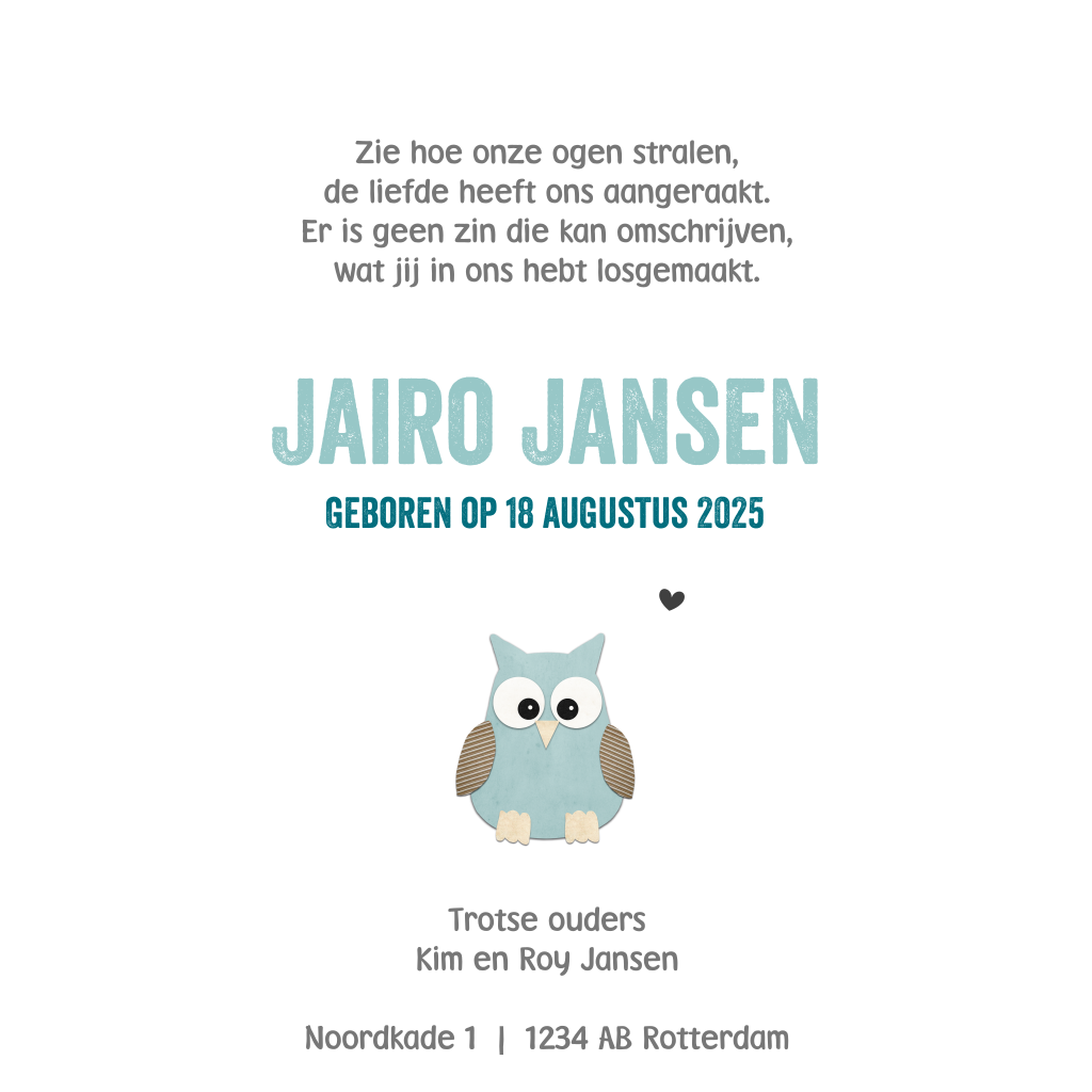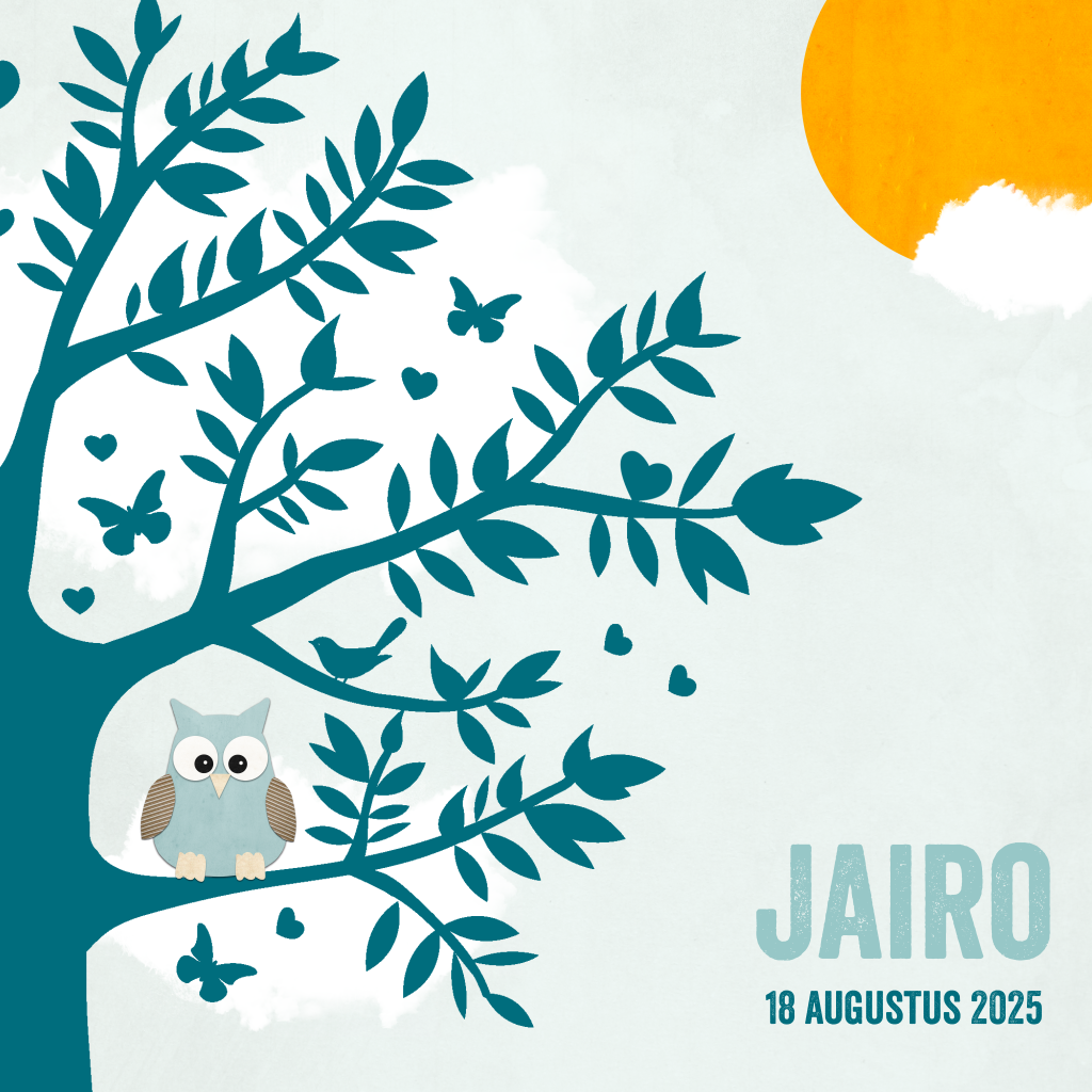Een mooi babykaartje met boom, vlinders, een uiltje en hoog aan de hemel de zon. Welkom lief jongetje! Pas de tekst en de kleuren aan in de editor.