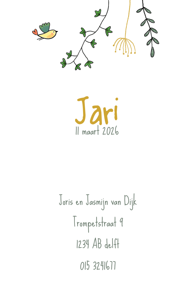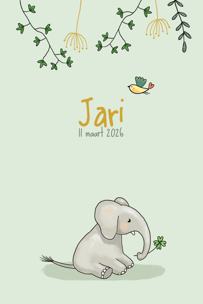 Een lief en hip, getekend geboortekaartje voor een jongen met olifantje, vogel en plantjes op een groene achtergrond. Dit geboortekaartje kan je eenvoudig zelf naar wens aanpassen.