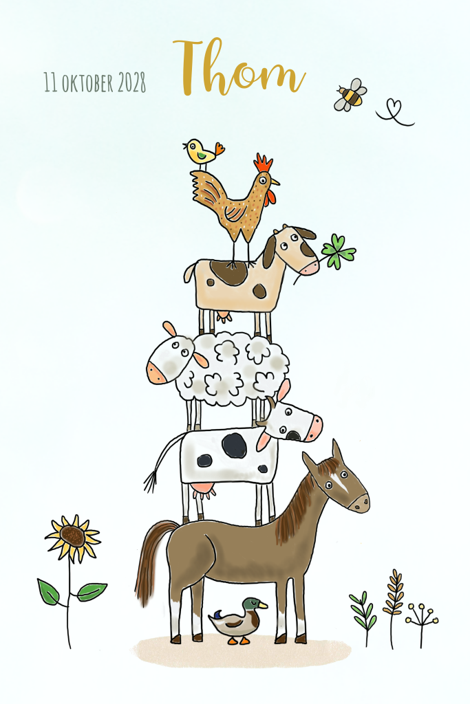 Geboortekaartje met stapel boerderijdieren voor een jongen