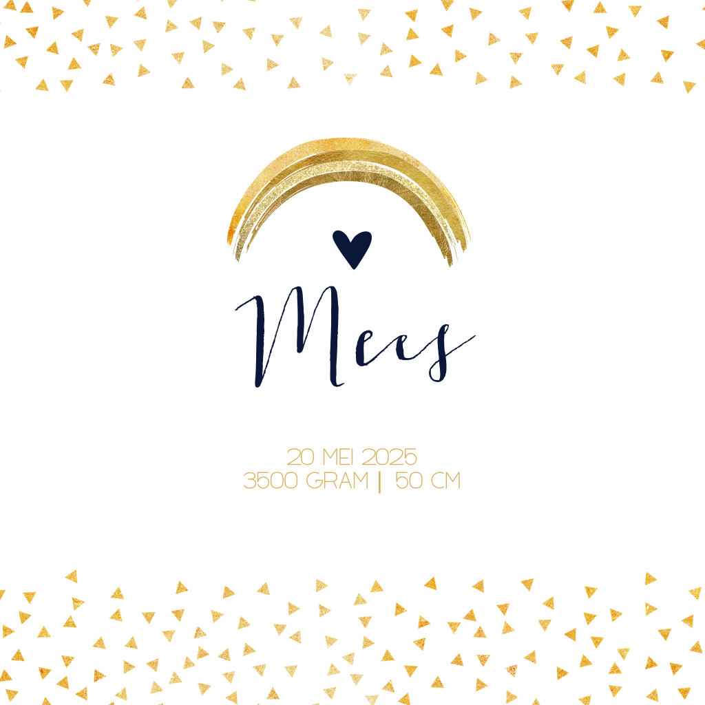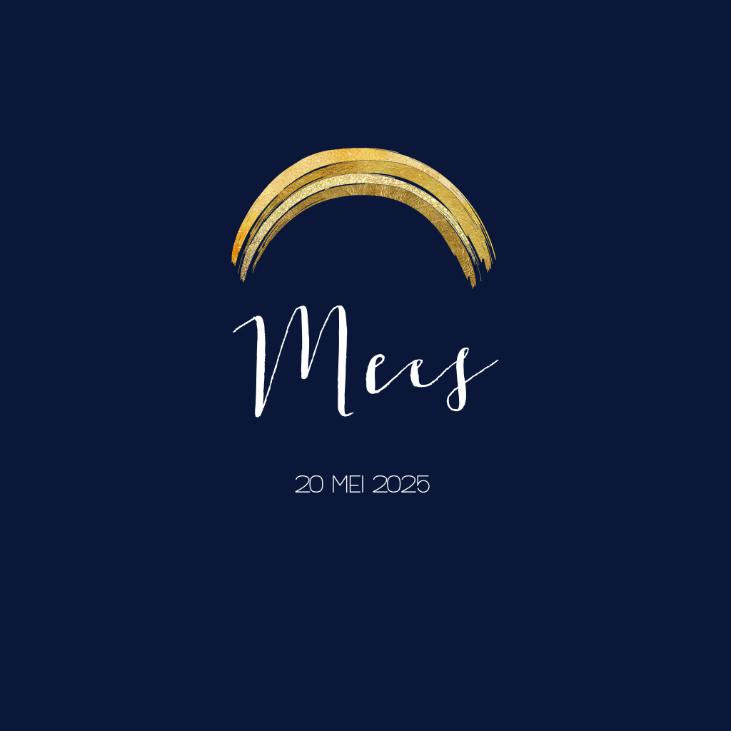 Hip geboortekaartje voor jongen met donkerblauwe achtergrond en goudkleurige regenboog. De achtergrondkleur kun je natuurlijk ook zelf aanpassen. Aan de binnenkant vind je gouden hartjes.