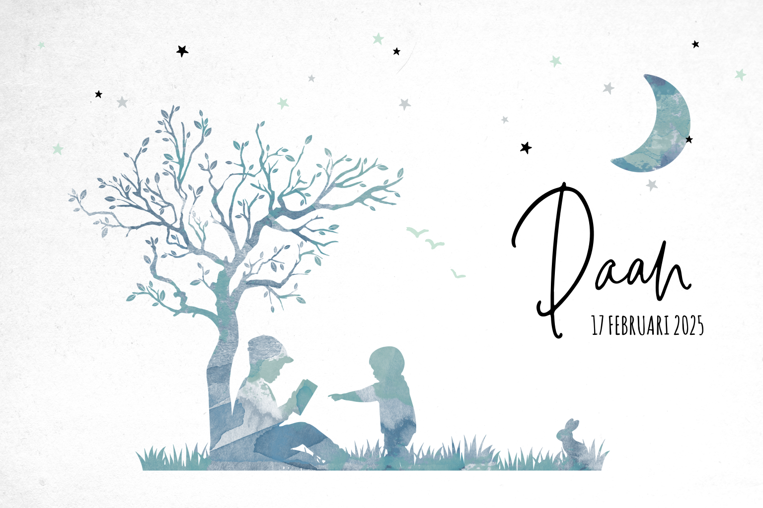Lief geboortekaartje voor een jongetje met lichtblauw silhouet van twee broertjes zitten onder de boom. Vanuit de lucht schijnt een maan met sterretjes op de broertjes. In de online editor kan je eenvoudig kleuren, lettertypes en vele andere opties aanpassen. Zo creëer je precies de kaart die bij je past!