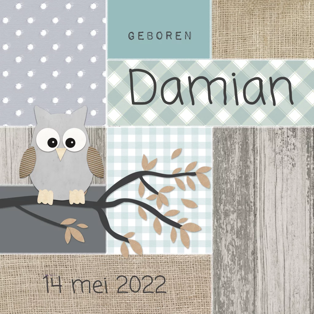 Stoer geboortekaartje met uiltje die zit op een tak en leuke vlakken met verschillende stofjes en structuren.